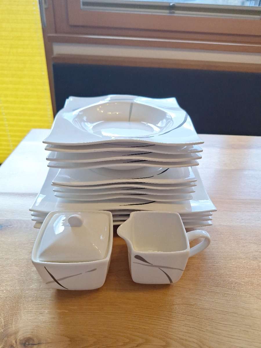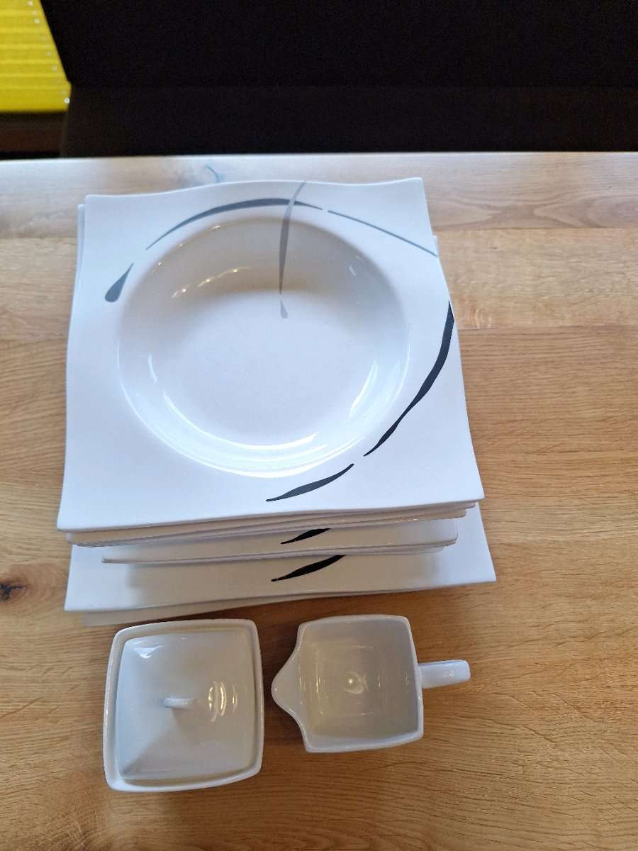 Jeweils 4 Telller, Milch und Zuckerbehälter