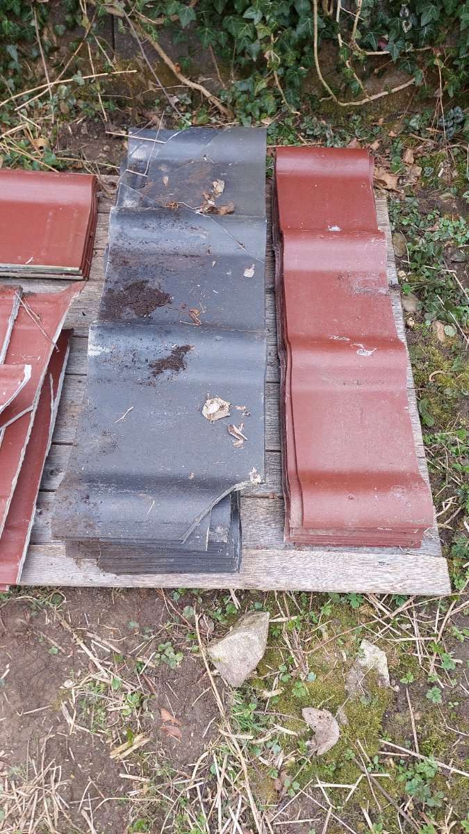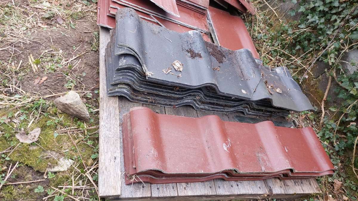 Verschenke eine kleine Menge Reste von Eternit-Dachplatten. Ideal für Ausbesserungsarbeiten oder kleine Projekte (z.B. Kleintierstall, Unterstand). Modell: Unbekannt (siehe Fotos). Menge: Nur die abgebildeten Reste. Nur Selbstabholung in Häusling, 3392.