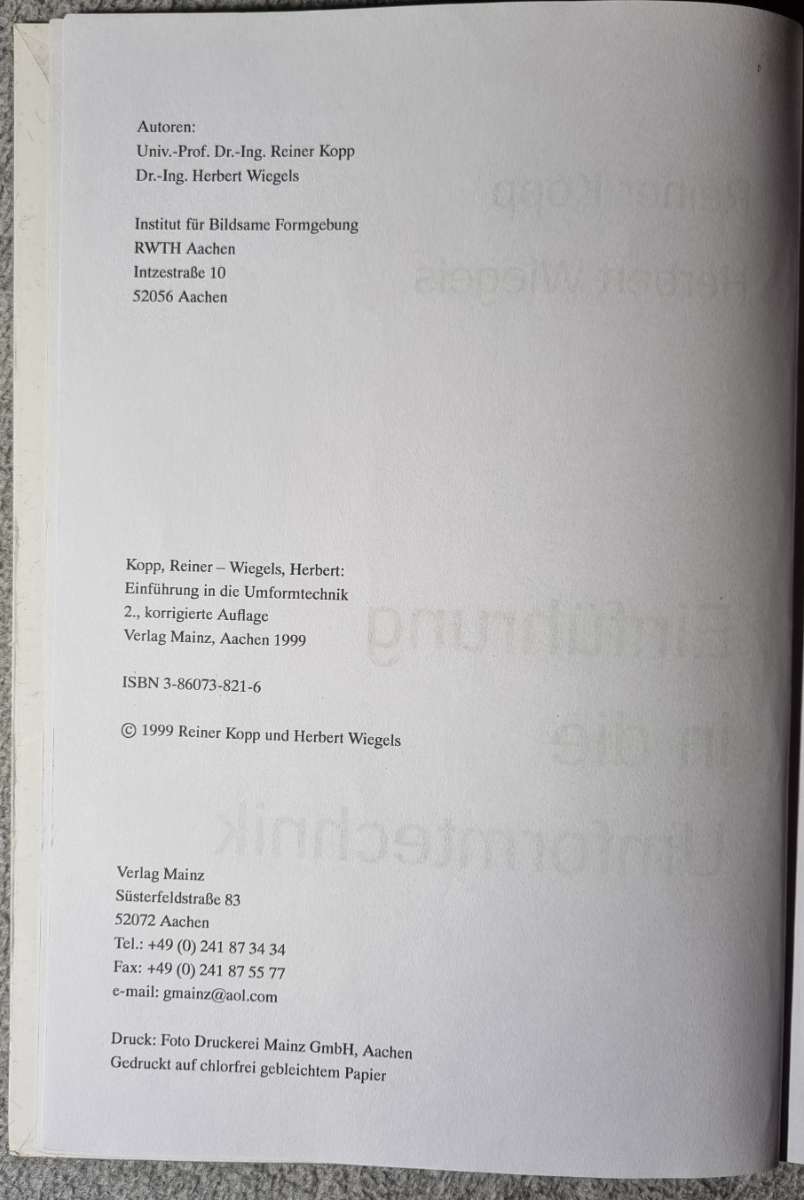 Einführung in die Umformtechnik, Reiner Kopp, Herbert Wiegels, ISBN 3-86073-821-6