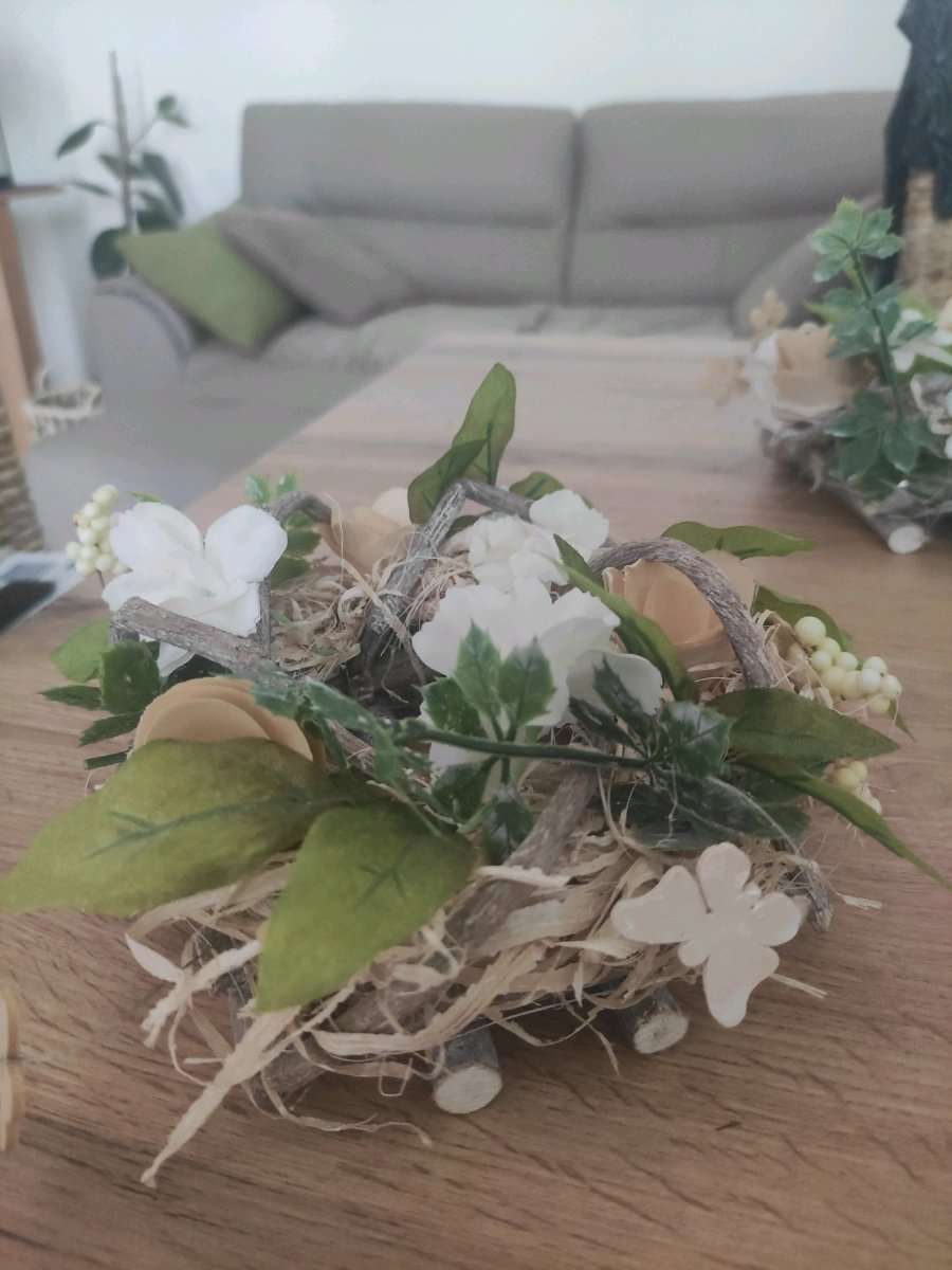 Deko: Holz, Korbgeflecht, Kunstblumen neuwertig