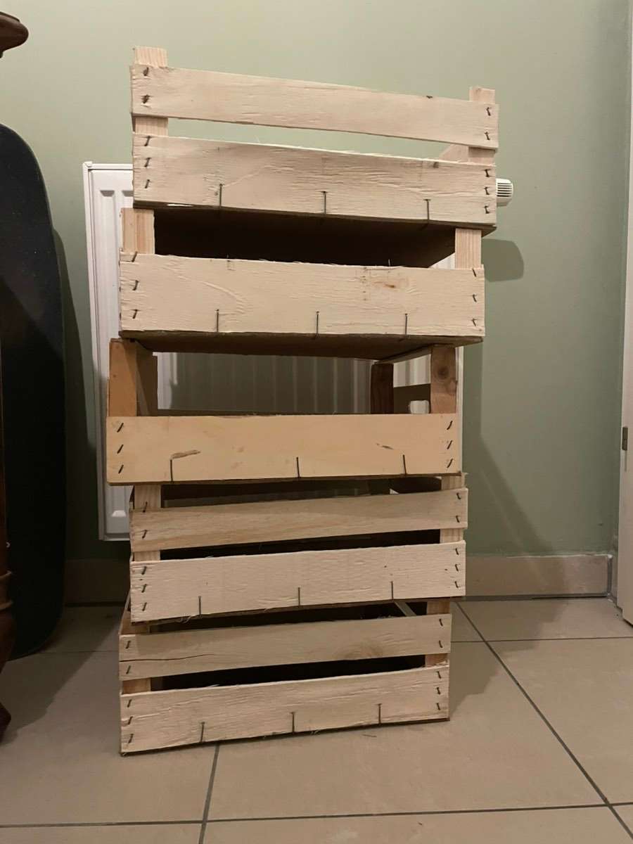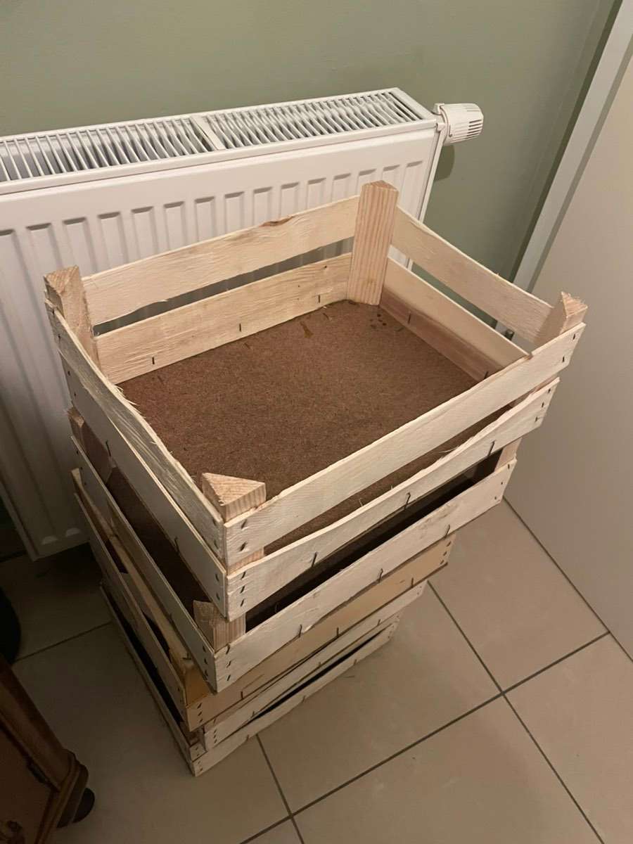 5 Obstkisten 29*39 cm, Höhe unterschiedlich. Hab darin Zitrusfrüchte und Gemüse aus Sizilien bekommen. Nicht ganz sauber, aber lassen sich sicher noch ganz gut reinigen.