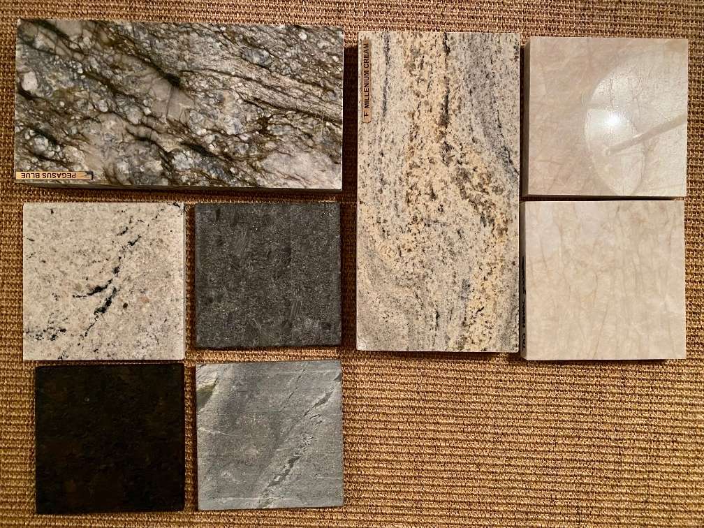 Muster von verschiedenen Steinplatten und Oberflächen für Arbeitsplatten und Fensterbänke Sorten: Steel Grey Coffee Brown Atlantis Taj Mahal Pegasus Blue Millenium Cream Ivory Cream
