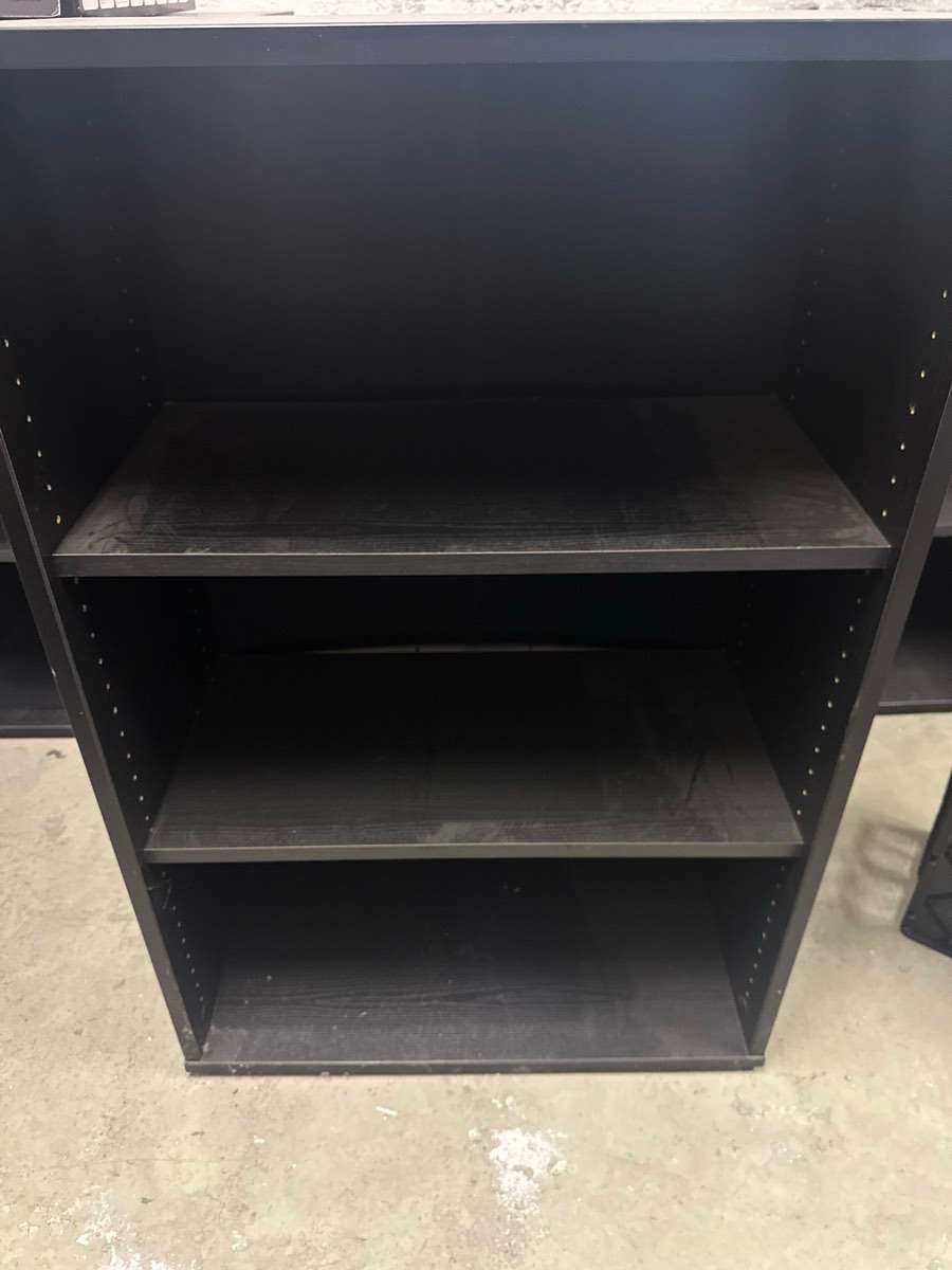 4 Regale, schwarz, funktionstüchtig aber in stark gebrauchtem Zustand. 80cm breit, 120cm hoch, 40cm Tiefe