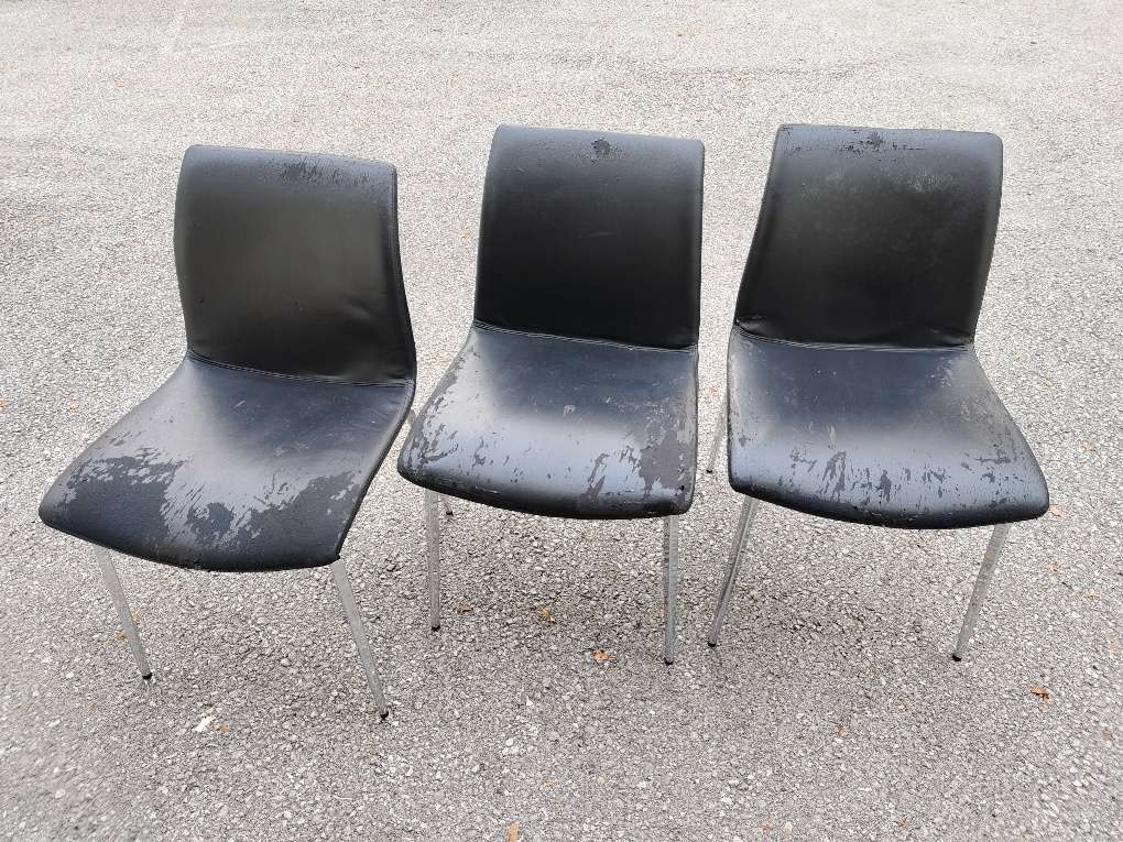 3 Sessel, abgenützt, aber bequem. ;) Drehbar nach links und rechts. Silberne Beine, schwarze Kunstlederschale 12 Euro für alle 3 Stühle
