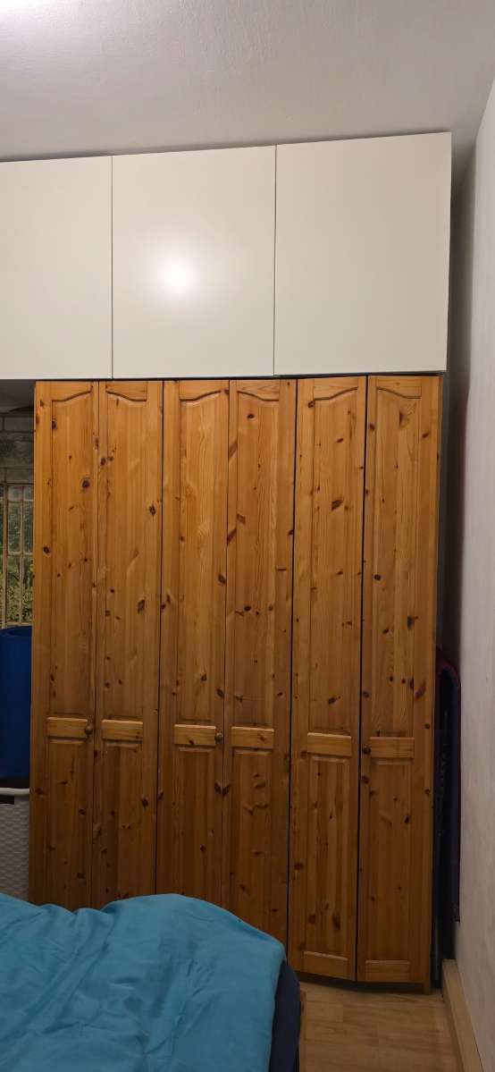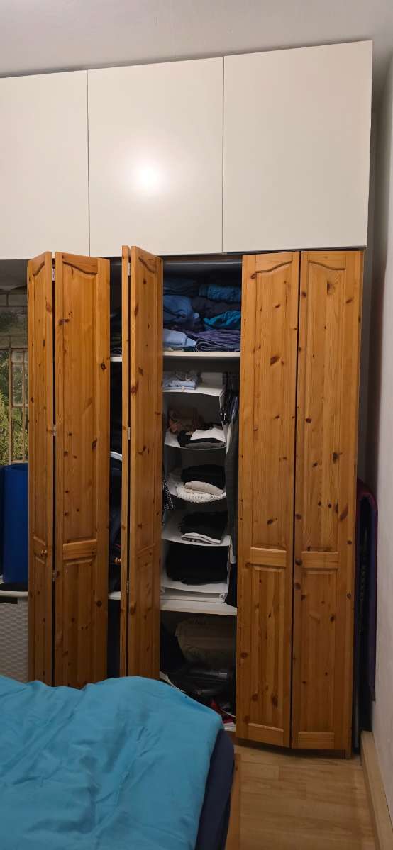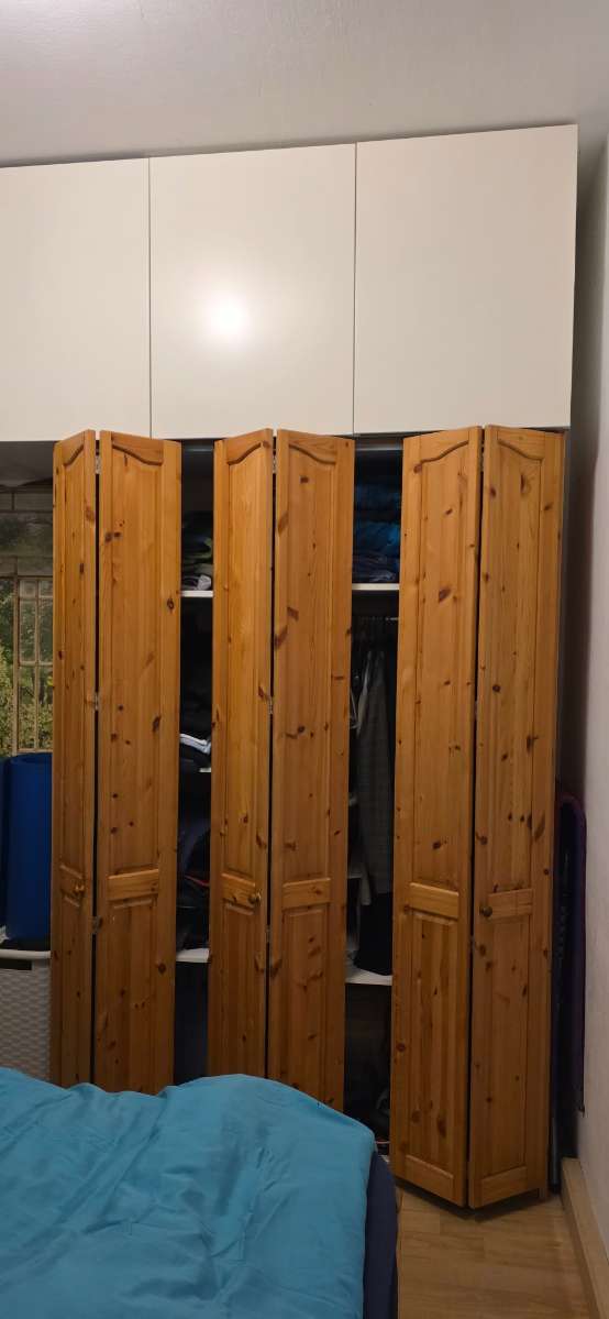 Brauner Kasten (unterer Schrank): Klassischer, freistehender Kleiderschrank aus Kiefer Warmes, naturbelassenes Holz mit sichtbarer Maserung und Astlöchern → eher rustikaler Stil. Mehrere schmale Türen (ca. 4–5), jeweils mit einfachen Holzgriffen. Je 25...