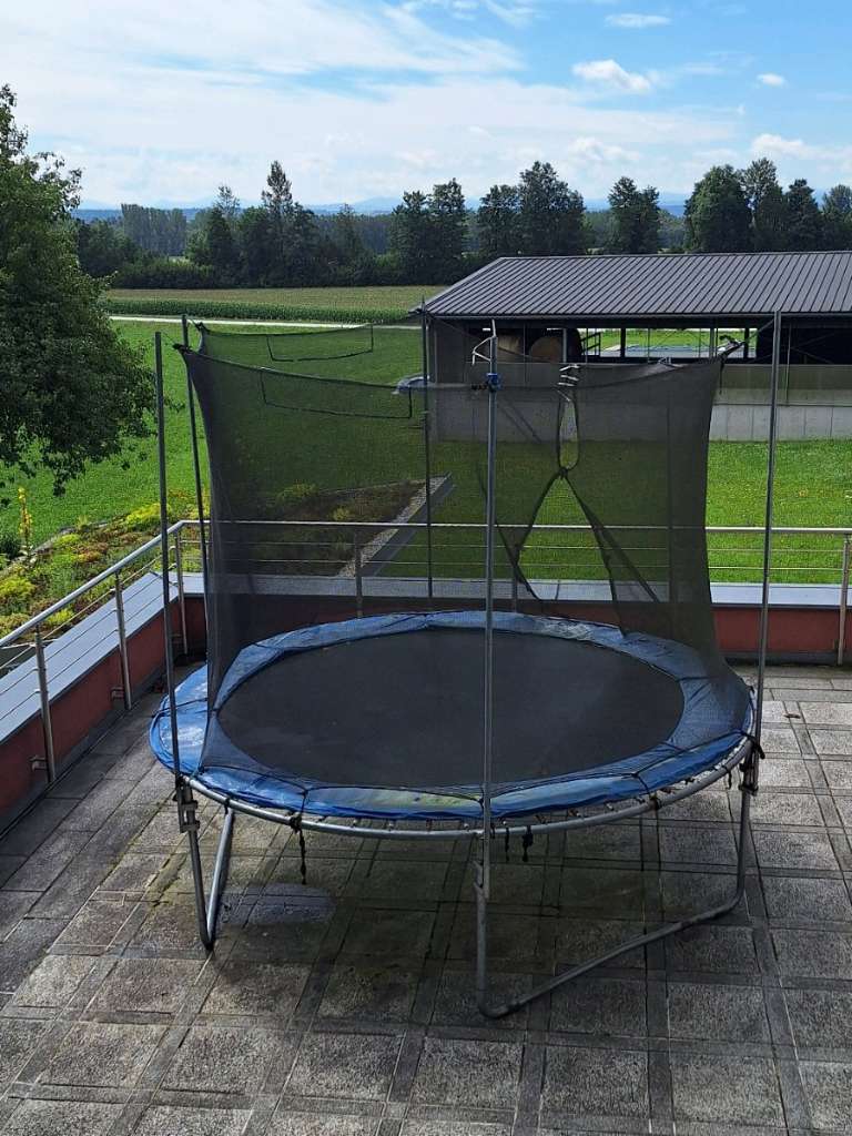 Das Trampolin muss voraussichtlich zerlegt werden, da es auf der Terrasse über der Garage steht, außer es kommt jemand mit einem LKW mit Kran.