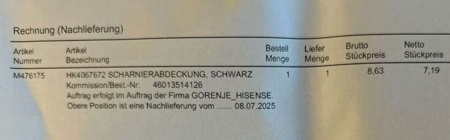 Scharnierabdeckung oben siehe Artikelbeschreibung. Nur zu verschenken also kein Versand es sei denn Sie zahlen mir die Versandkosten und einen Aufwand. Solange der Artikel online ist ist er auch verfügbar.