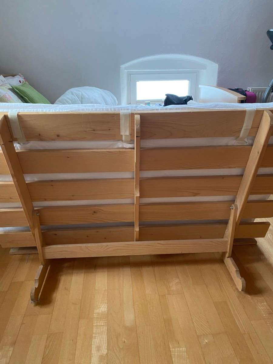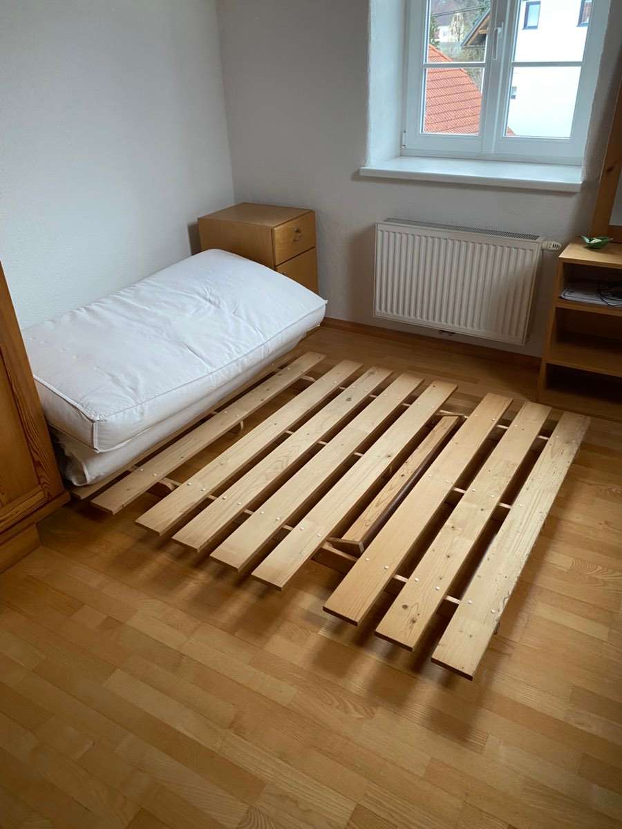 Sofabett zu verschenken Stabile Holzkonstruktion und einfacher Klappmechanismus zum Auf- und Abbauen Stabile Füllung und weißer Bezug zum Abnehmen Maße: 140x 200 cm Liegefläche Tiefe der gesamten Konstruktion wenn zusammengeklappt ca. 100 cm...