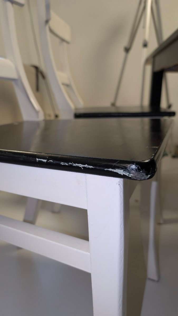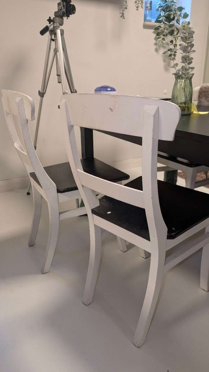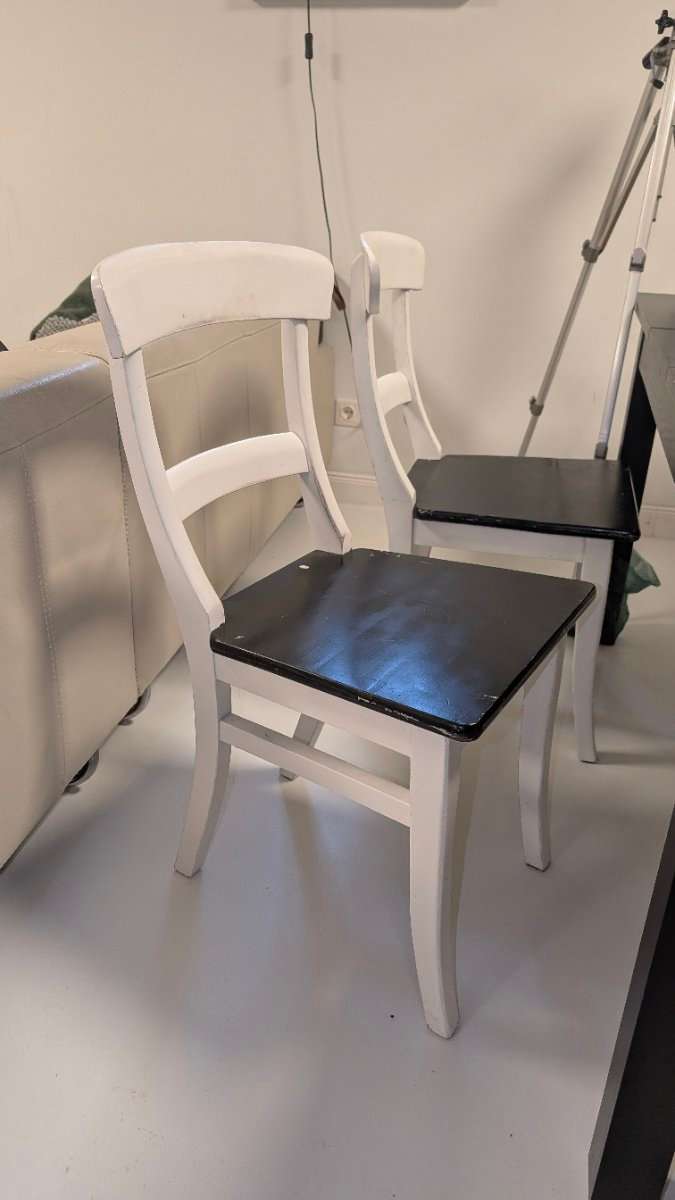 Verkaufe 4 Esszimmerstühle aus Holz Die Stühle sind gebraucht und wurden selbst weiß und schwarz lackiert, daher ist die Oberfläche nicht mehr ganz perfekt (siehe Fotos). Mit etwas Schleifen und neuem Lack lassen sie sich aber easy wieder auffrischen....