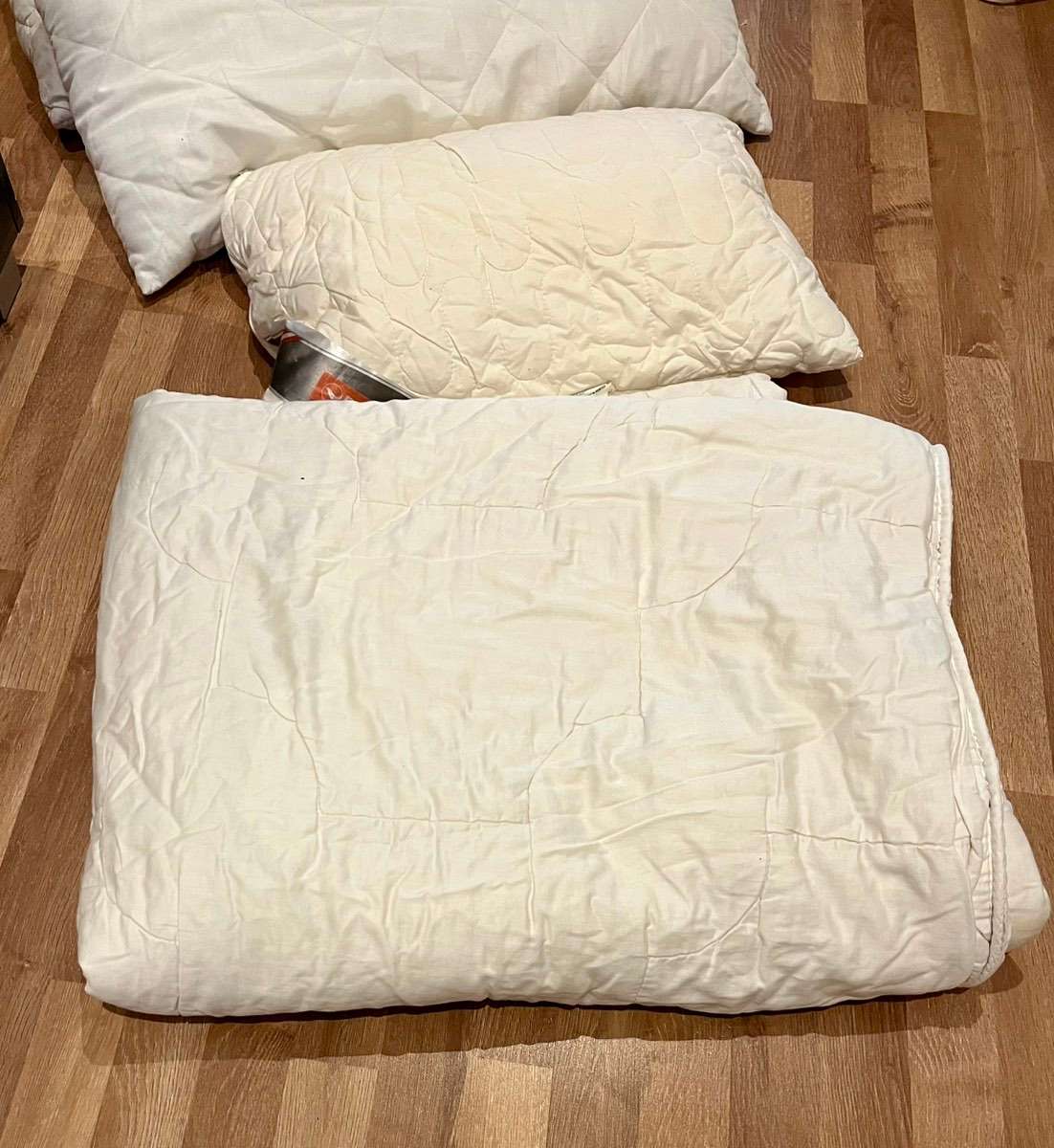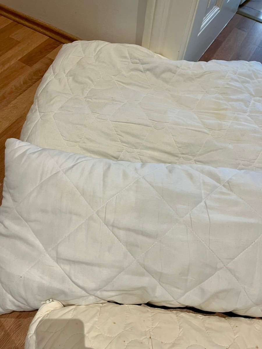 3 Kopfkissen unterschiedlicher Größe und 1 warme Bettdecke. Alle weisen Gebrauchsspuren auf. Nur Abholung.