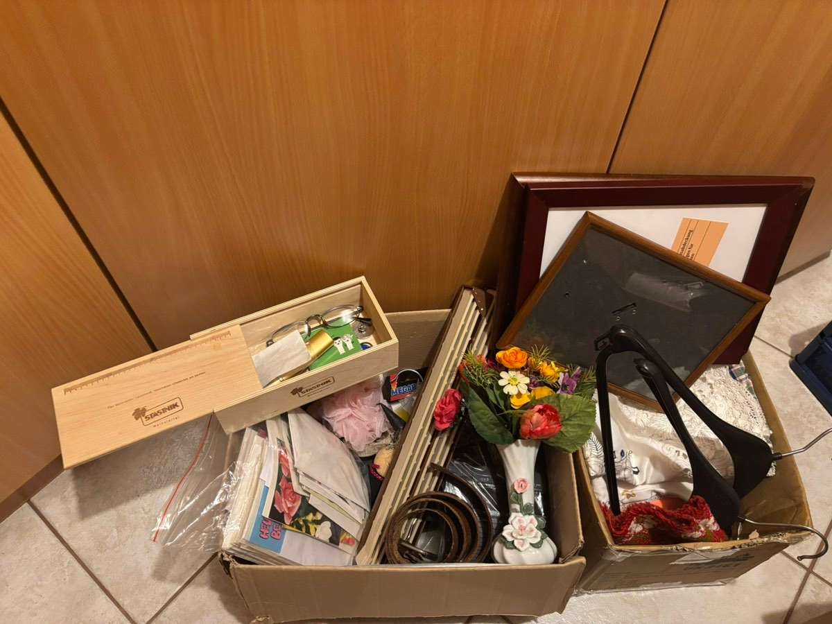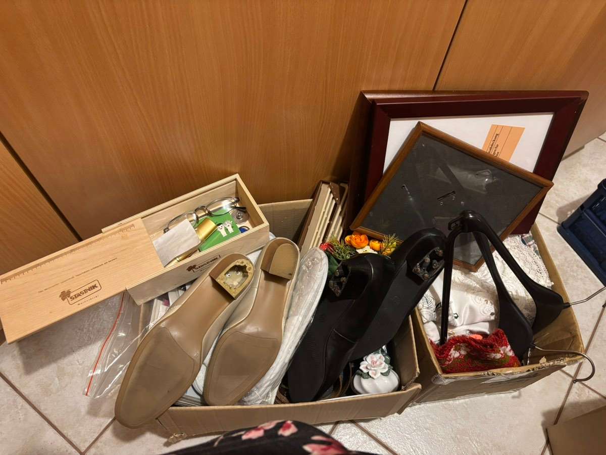 Aus Haushaltsauflösung allerlei Deko, Gebrauchsgegenstände, Kleiderhaken,Vase, Bilderrahmen, 2Paar Lederschuhe ( vollkommen in Ordnung bis auf Absätze) zahlreiche Glückwunschbilletts, Lesebrillen, Tischdecken ….. Nur gesamt abzugeben !