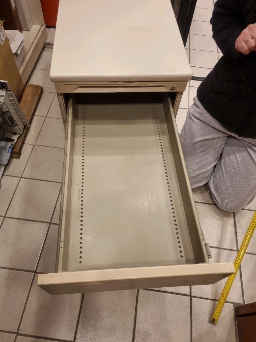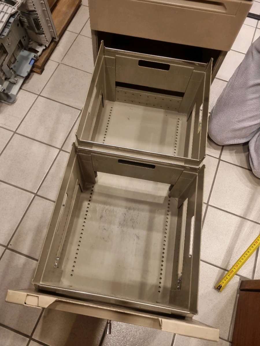 Rollcontainer mit 3 Laden; 1x kleine Utensilien, 1x für Hängematten, 1x für diverses Masse 80cm Tiefe, 42,5cm Breite, 60cm Höhe Steht auf Rollen, vorne arretierbar Von den Laden sind 2 Griffe ausgebrochen. Nur Selbstabholung!