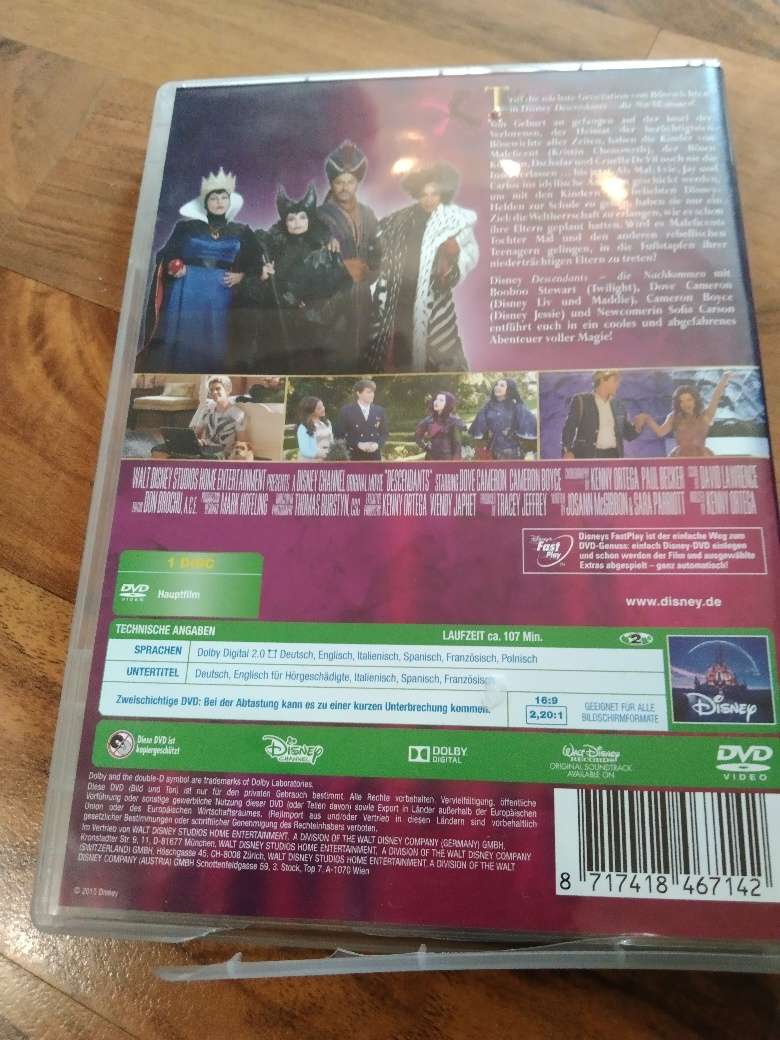 Verschenke eine DVD von Disney Descendants-Die Nachkommen Hülle ist bisschen beschädigt,daher gratis Abholung in 1200 Wien Versand zzgl aktueller Postgebühr oder Paydelivery BITTE BEACHTEN SIE AUCH MEINE ANDEREN ANZEIGEN!!