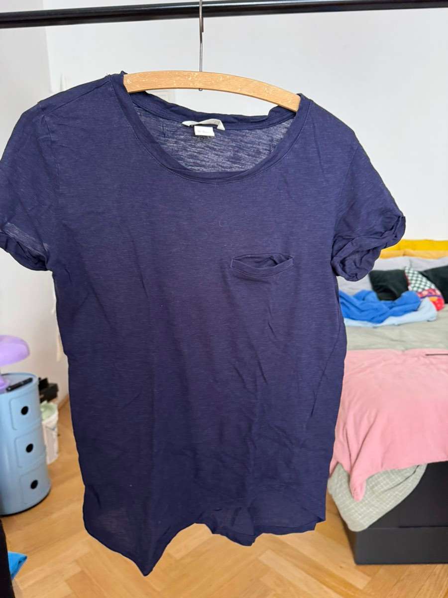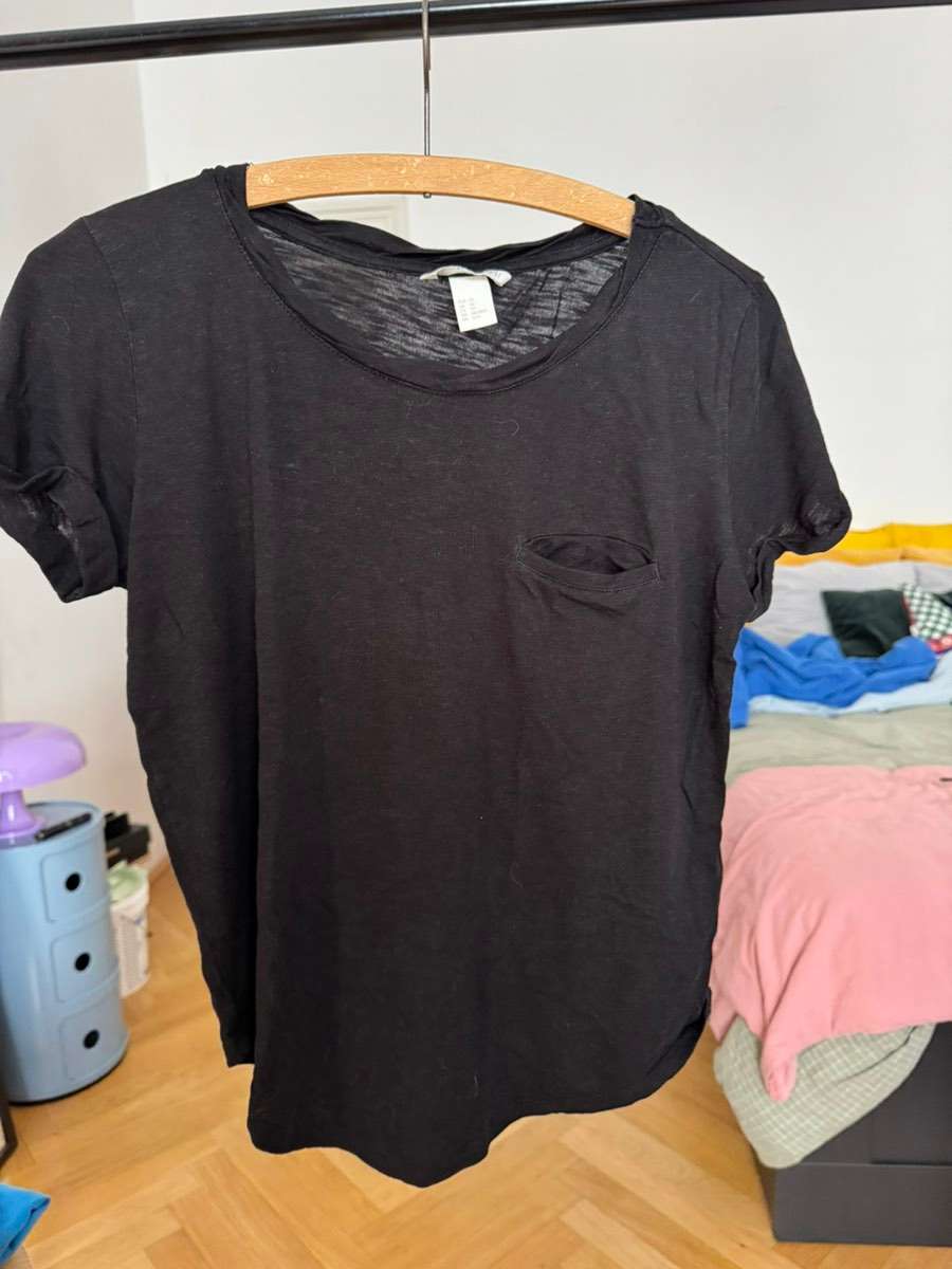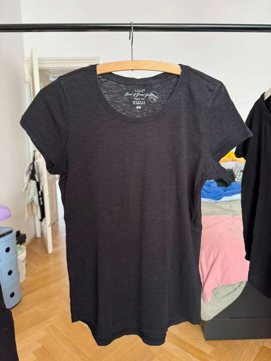 Ich verschenke drei Tshirts von h&m, zwei schwarze und ein blaues. Die zwei tshirts mit der Tasche sind Größe XS, das andere ist Größe M.