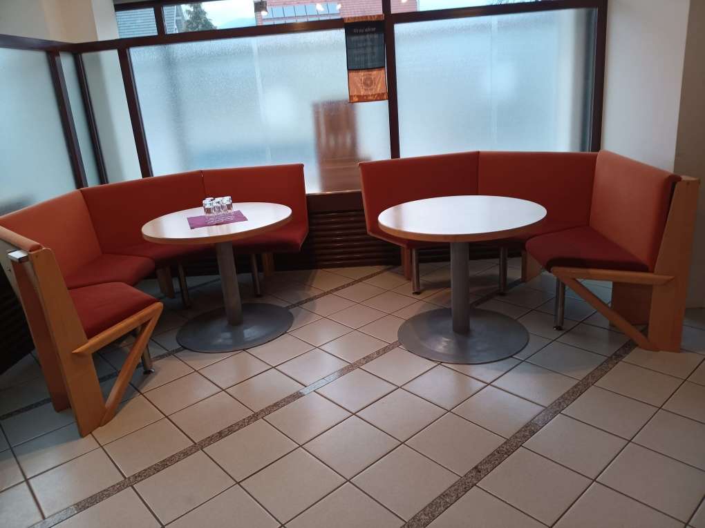 2 runde Tische und 2 gepolsterte Sitzelemente