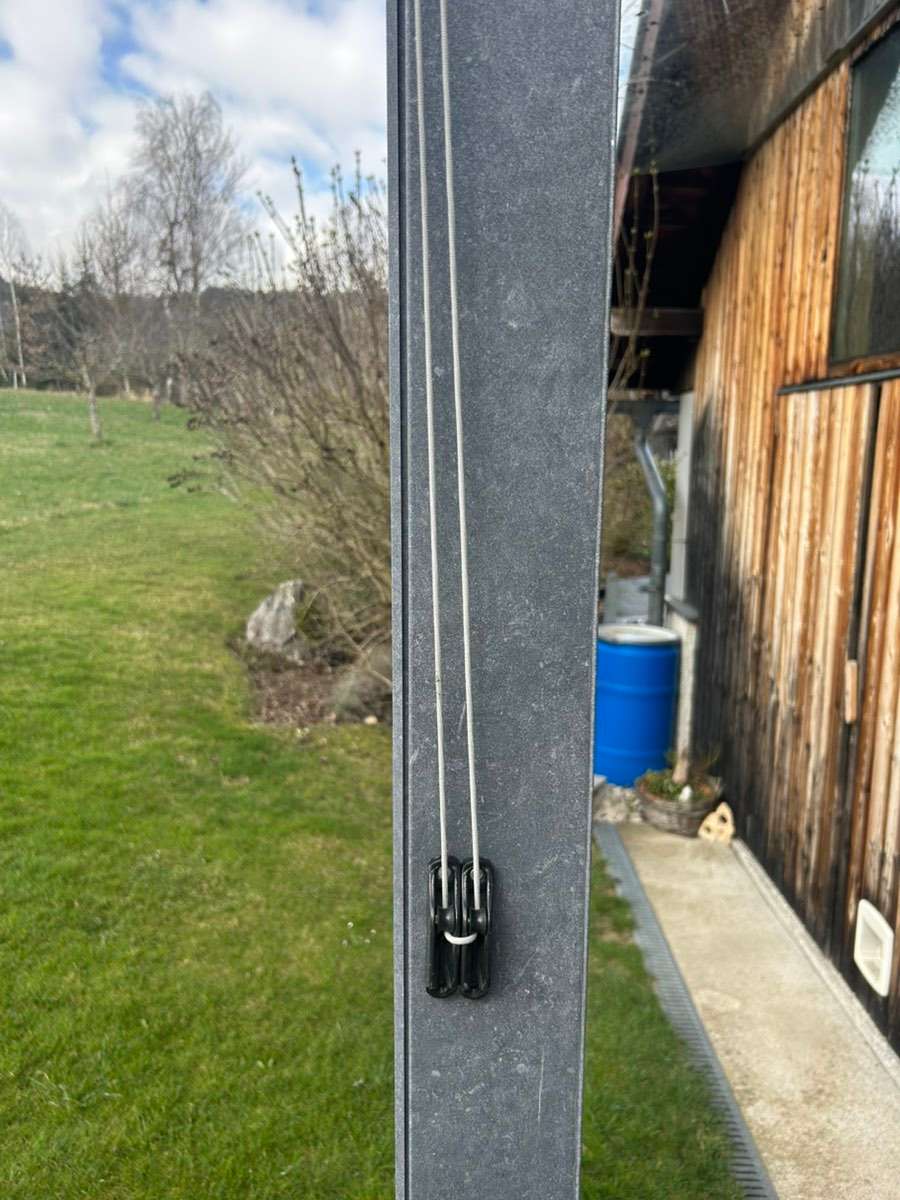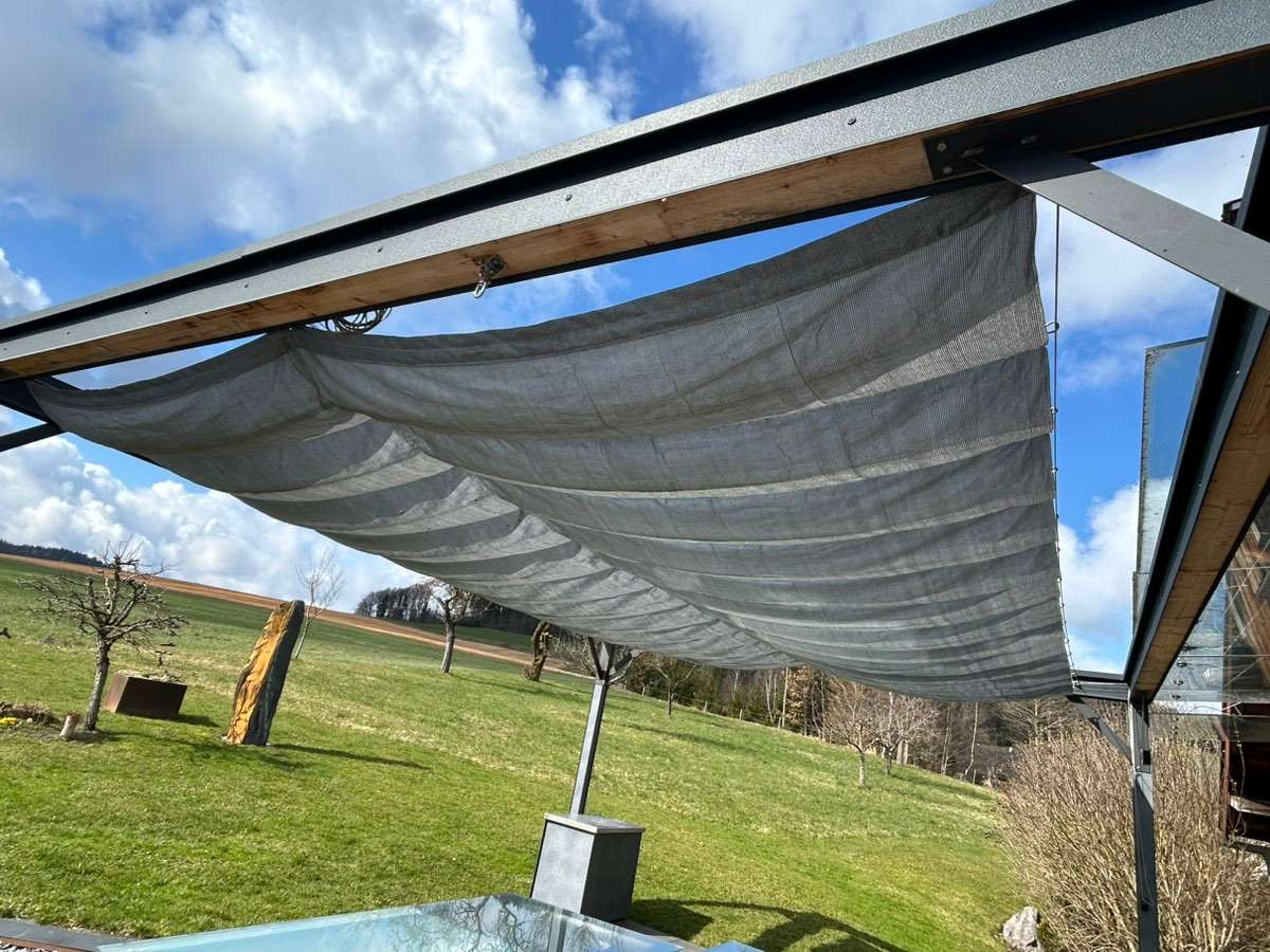 Sonnensegel zu verschenken Größe 5,7m x4,0m mit Seilzug mit Gebrauchsspuren Spannseil 5mm, Spannschlösser und Karabiner in Edelstahl um € 50,- zu verkaufen Privatverkauf daher keine Garantie, Gewährleistung oder Rücknahme möglich