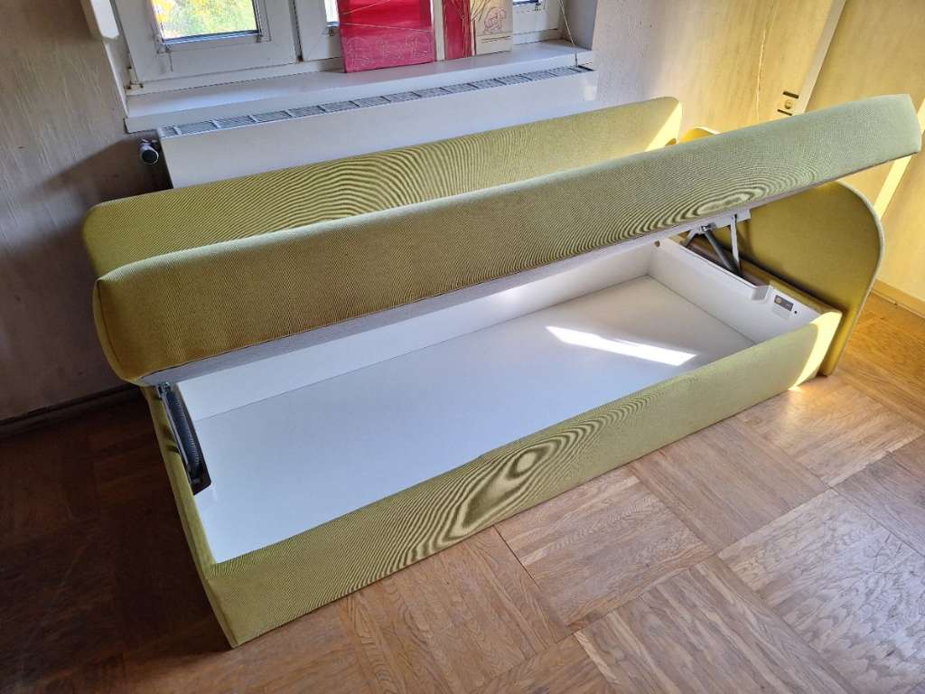 Joka- Bettsofa, mit aufklappbarem Stauraum. Größe 90x200cm, hellgrün, einfarbig. (Anmerkung: Das Muster am Foto 2, unten, existiert nur am Foto. Foto 1 entspricht der Realität). Einwandfreier Zustand.