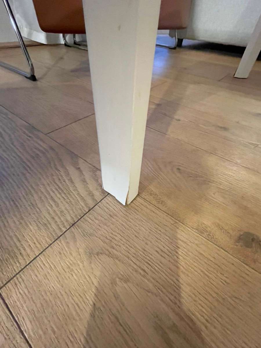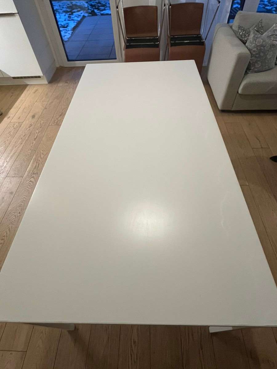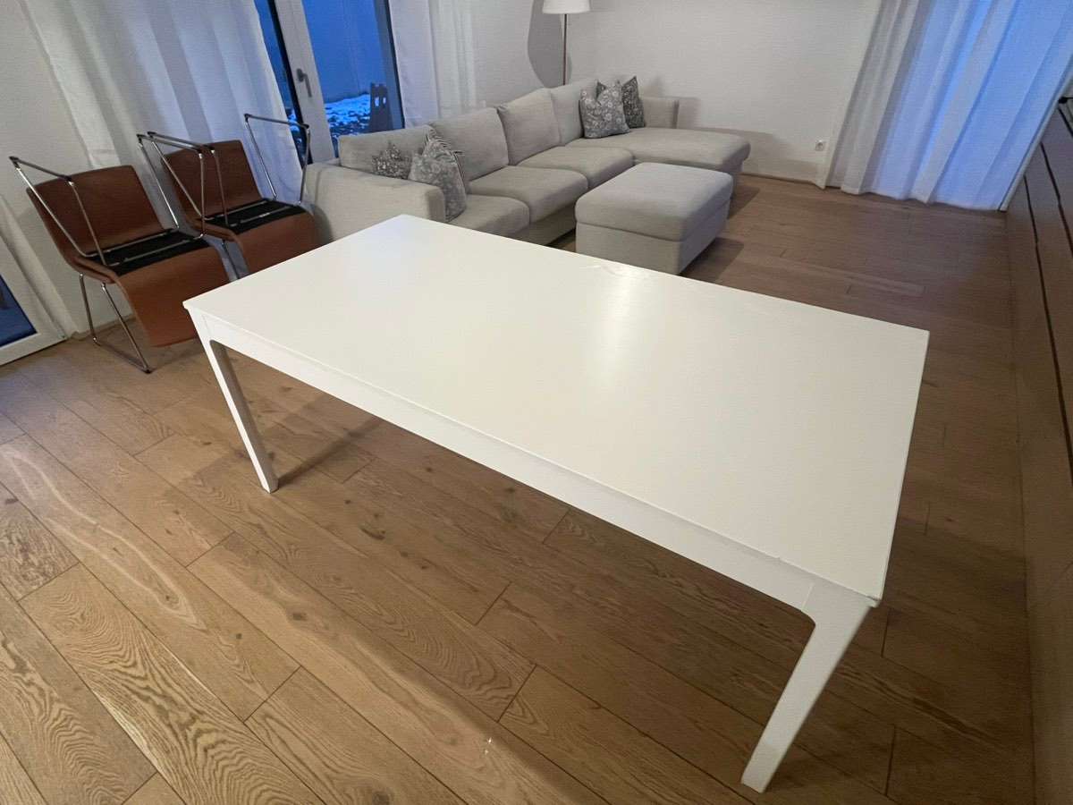 Wir verschenken unseren Esstisch: Maße 180x90, ausziehbar ist er auf eine Länge von 220cm Er weist schon starke Gebrauchsspuren auf. (Siehe Fotos)
