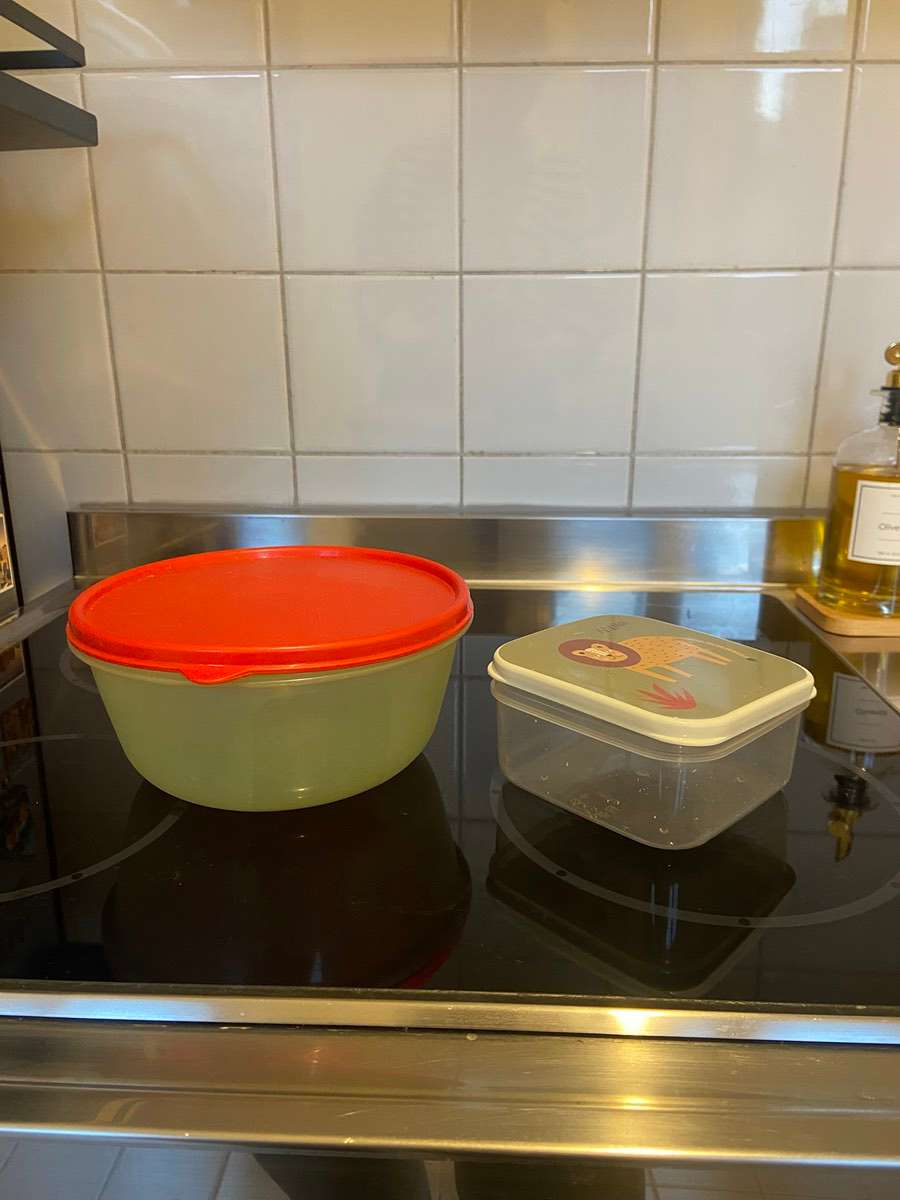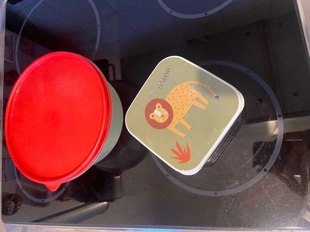 Verschenke zwei Tupperdosen, eine Tasse und einen Bierkrug