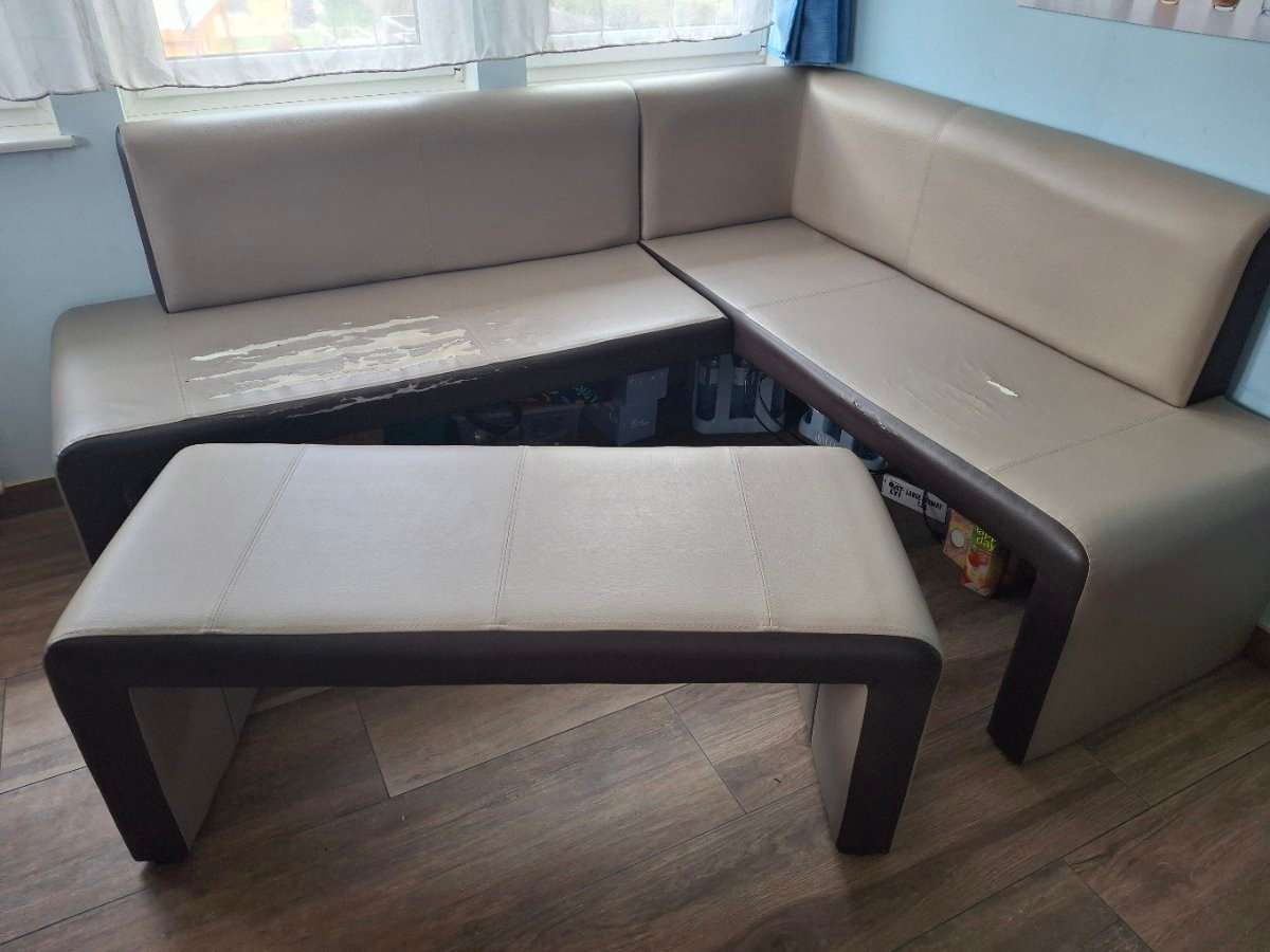 Kücheneckbank mit zusätzlicher freien Sitzbank. Das Kunstleder der Eckbank löst sich an mehreren Stellen schon auf. Vielleicht könnte man es neu überziehen. Die Sitzbank ist noch einwandfrei. Eckbank: 160×200 cm Sitzhöhe: 50cm Sitzbank: 120x50 cm Nur...