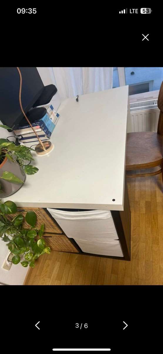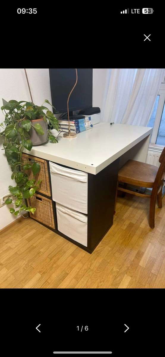 Schreibtisch, auf der einen Seite mit Platte statt Beinen auf der anderen Seite mit 4x4 Kallax Regal. Exkl. Körbe. Deckplatte für das kallax Regal gibt es auch noch, man könnte es also auch als Regal so benutzen . H77,5cm T79,5 B115