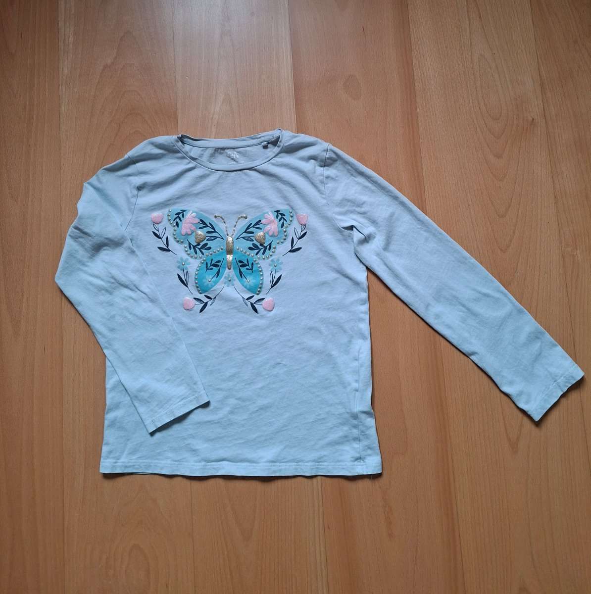 C & A Mädchen T-Shirt langarm hellblau mit Schmetterlingsaufdruck Größe 140 zu VERSCHENKEN! genähte kleine Löcher - siehe Fotos aus tierfreiem Nichtraucher-Haushalt Abholung in 1030 Wien oder 2000 Stockerau Postversand möglich!!!!!