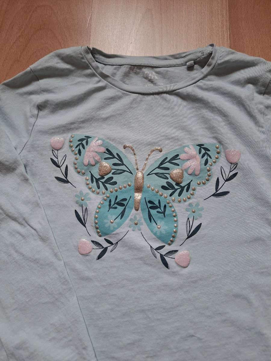 C & A Mädchen T-Shirt langarm hellblau mit Schmetterlingsaufdruck Größe 140 zu VERSCHENKEN! garm weiß mit Mädchenaufdruck Größe 140