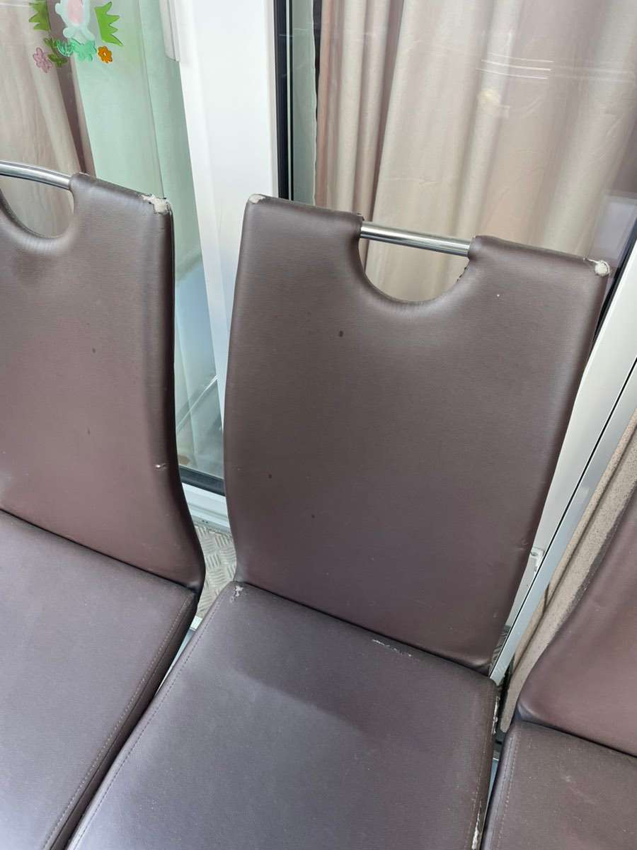 Wir verschenken unsere Esszimmerstühle. Alle sind ein bisschen an der Stuhllehne beschädigt - auf den Bildern ersichtlich.