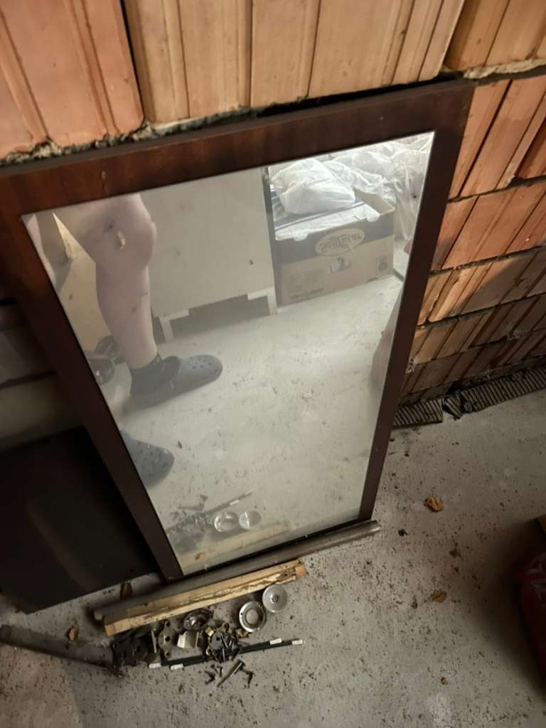 sehr alter Spiegel, rundherum Mahagonibrau, staubig vom Dachboden Größe Gesamt ca. 41 x 87 Selbstabholung nach rechtzeitiger telefonischer Absprache Privatverkauf, keine Garantie, keine Gewährleistung, kein Umtausch und keine Rücknahme