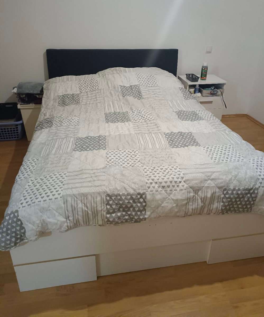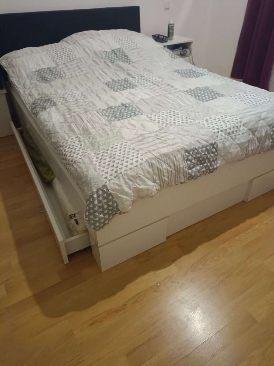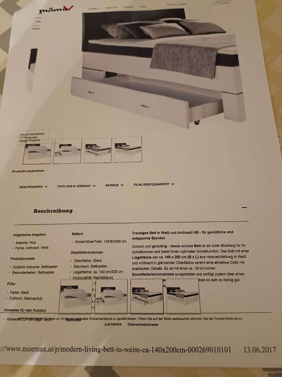 Bett weiß Hochglanz mit einer Bettzeuglade, Kopfteil grauer Stoff, 140x200m, mit Lattenrost und Matratze (diese wurde vor ca 1 1/2 Jahren gekauft und immer mit Matratzenschoner verwendet). Mängel: Hochglanzlack an manchen Stellen abgeschlagen (siehe...