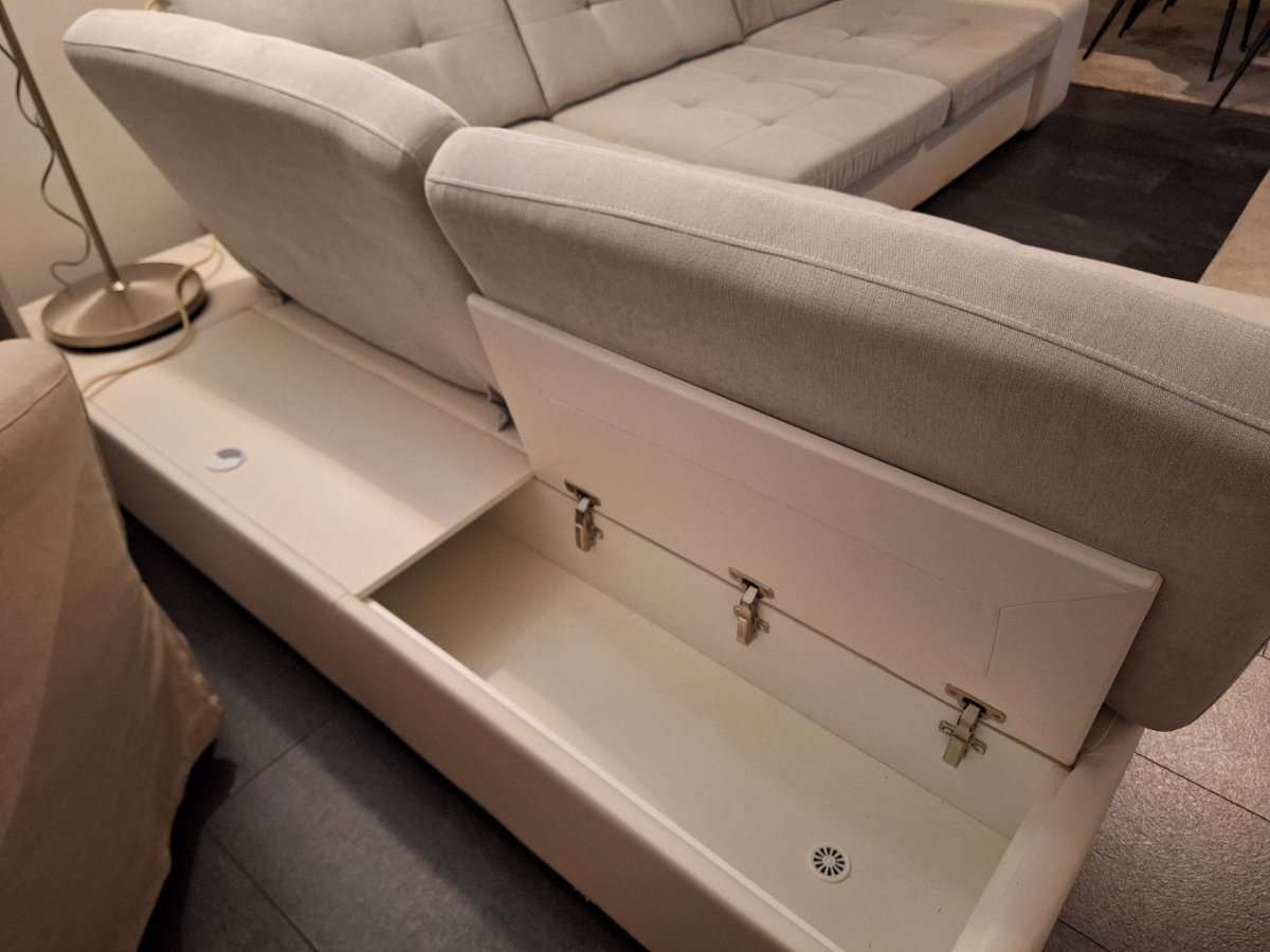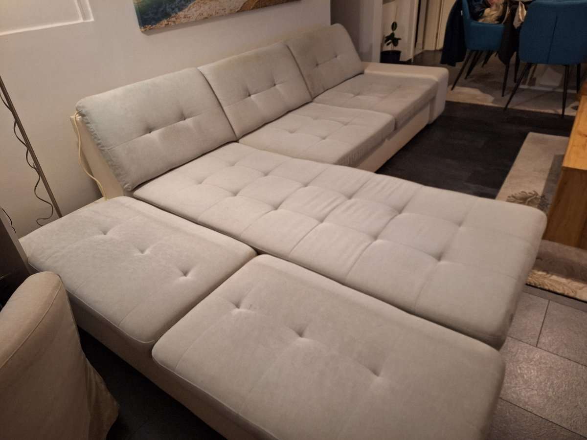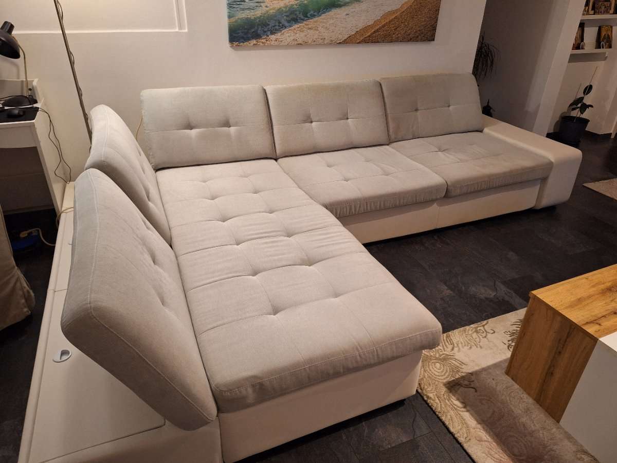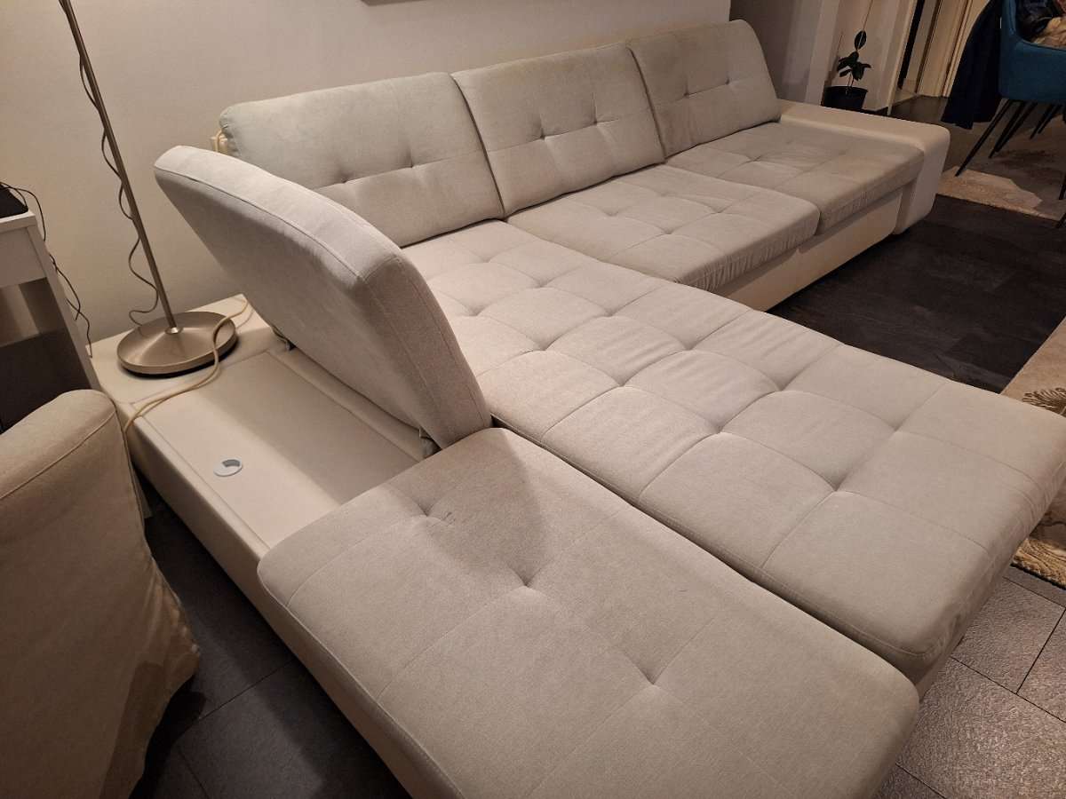 Gebraucht, leicht verschmutzt an manchen Stellen und Abnutzungsspuren an der Armlehne, sonst voll funktionsfähig. Ausziehteil nur ein paar mal in Gebrauch genommen. Stauraum vorhanden, wie auf den Fotos ersichtlich. Zu verschenken und nur Selbstabholung.