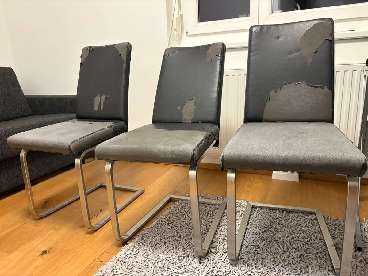 Hochwertige Schwingstühle vom Tischler, leider ist das Kunstleder nach 10 Jahren völlig unbrauchbar. Aber 2 der 3 Stühle sind davon abgesehen in supet Zustand wenn man sie neu bezieht. Bei einem Stuhl ist auch die Lehne verbogen Abholung nähe Praterstern...