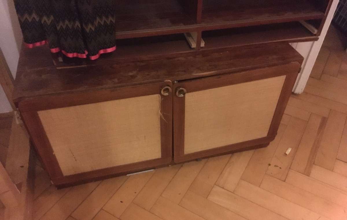 Der Kasten ist 52cm tief, 56cm hoch und 110cm breit. Innen gibt es auf beiden Seiten jeweils zwei Fächer, in der Mitte geteilt. Die rechte Tür hängt etwas, kann aber eingestellt werden. Auf den Bildern ist es das untere Möbel. Das obere (Regal) ist auch...