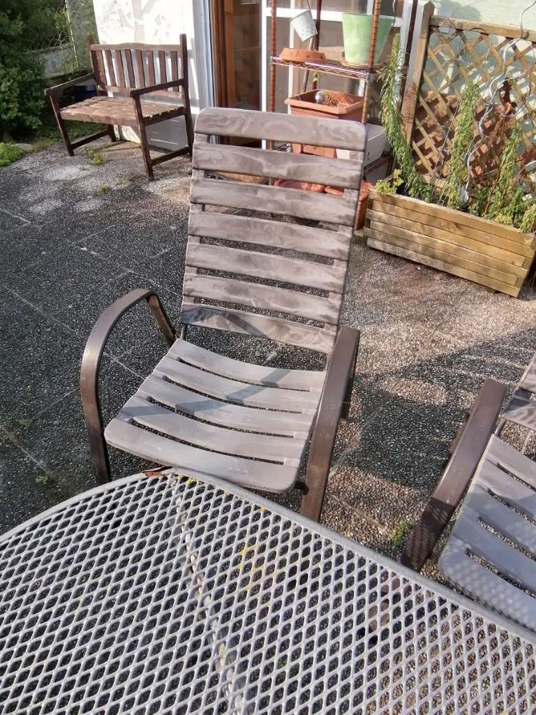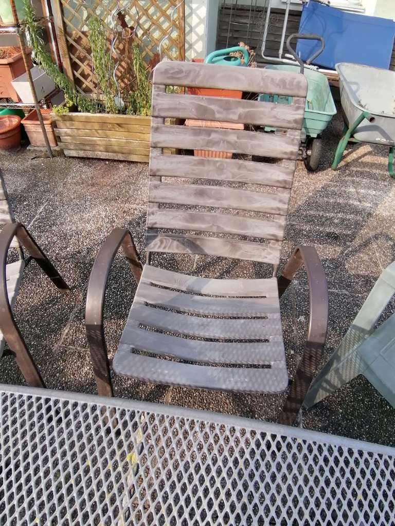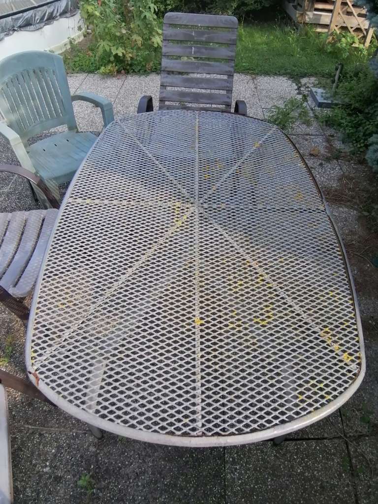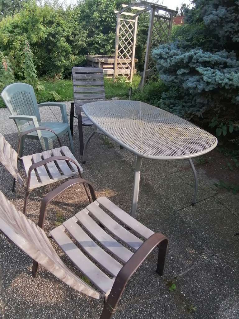 Abgeben wird ein stabiler Tisch mit 4 Sesseln. Bitte entnehmen Sie den Zustand aus den Bildern. Die Farbe blättert vom Tisch ab, aber grundsätzlich ist funktional betrachtet alles in Ordnung.