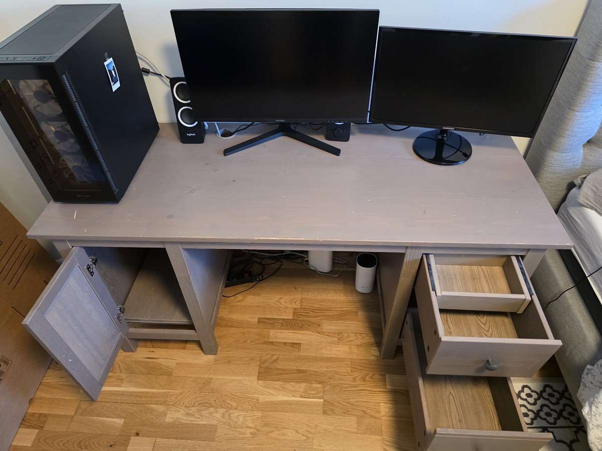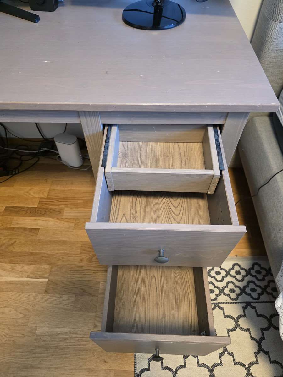 Verschenke einen IKEA Hemnes Schreibtisch in brauner Ausführung. Der Schreibtisch ist gebraucht, befindet sich aber in gutem Zustand und ist sehr stabil. Ideal für Homeoffice oder als klassischer Arbeitsplatz. Details: Modell: IKEA HEMNES Farbe: Braun...