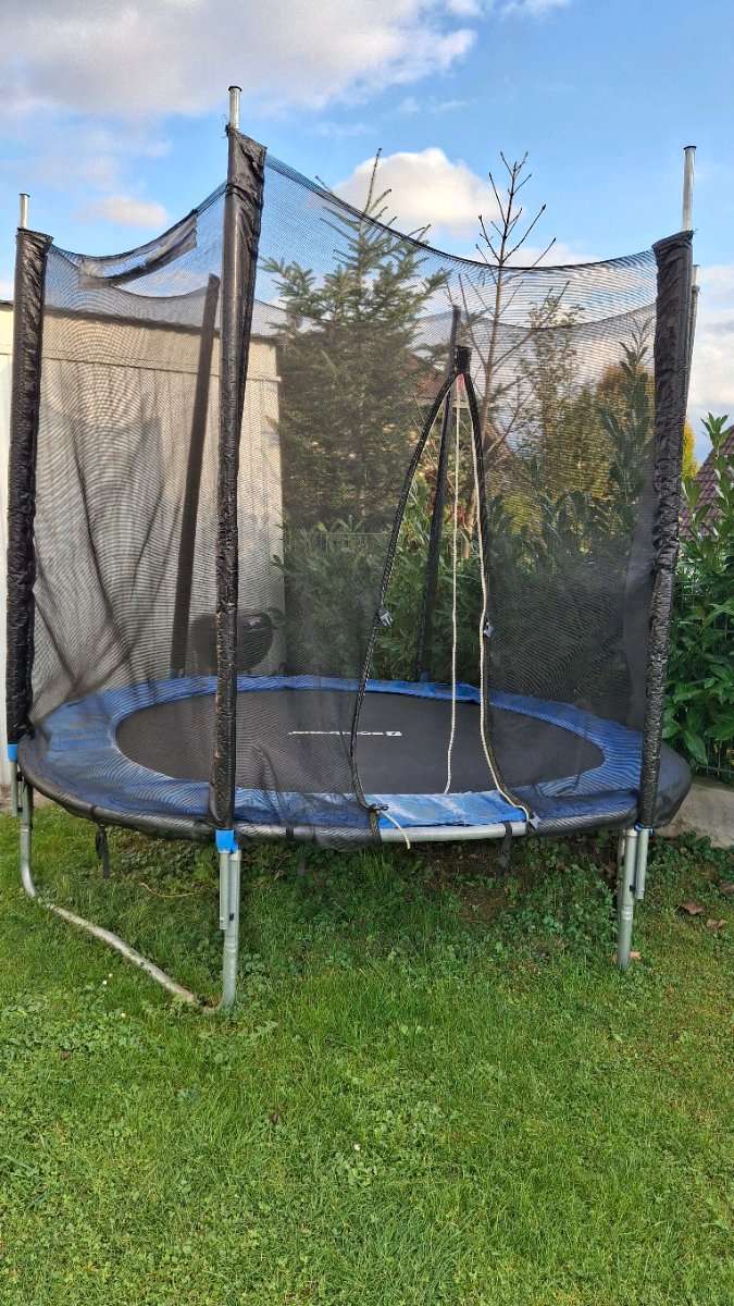Das Trampolin hat deutliche Gebrauchsspuren, ist aber bis jetzt im Einsatz. Selbstabbau und Transport, keine Rücknahme oder Garantie.