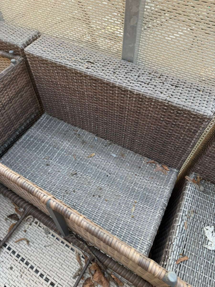 Balkon Garnitur zu verschenken. Besteht aus 5 Teilen, 4x mit Lehne, 1x ohne (kann als Tisch genutzt werden) Ist nicht mehr der Beste Zustand, es müsste eine Sitzauflage drauf gegeben werden. Maße sind 70 cm ohne Seitenlehne, 90 cm breit mit Lehne. Die...