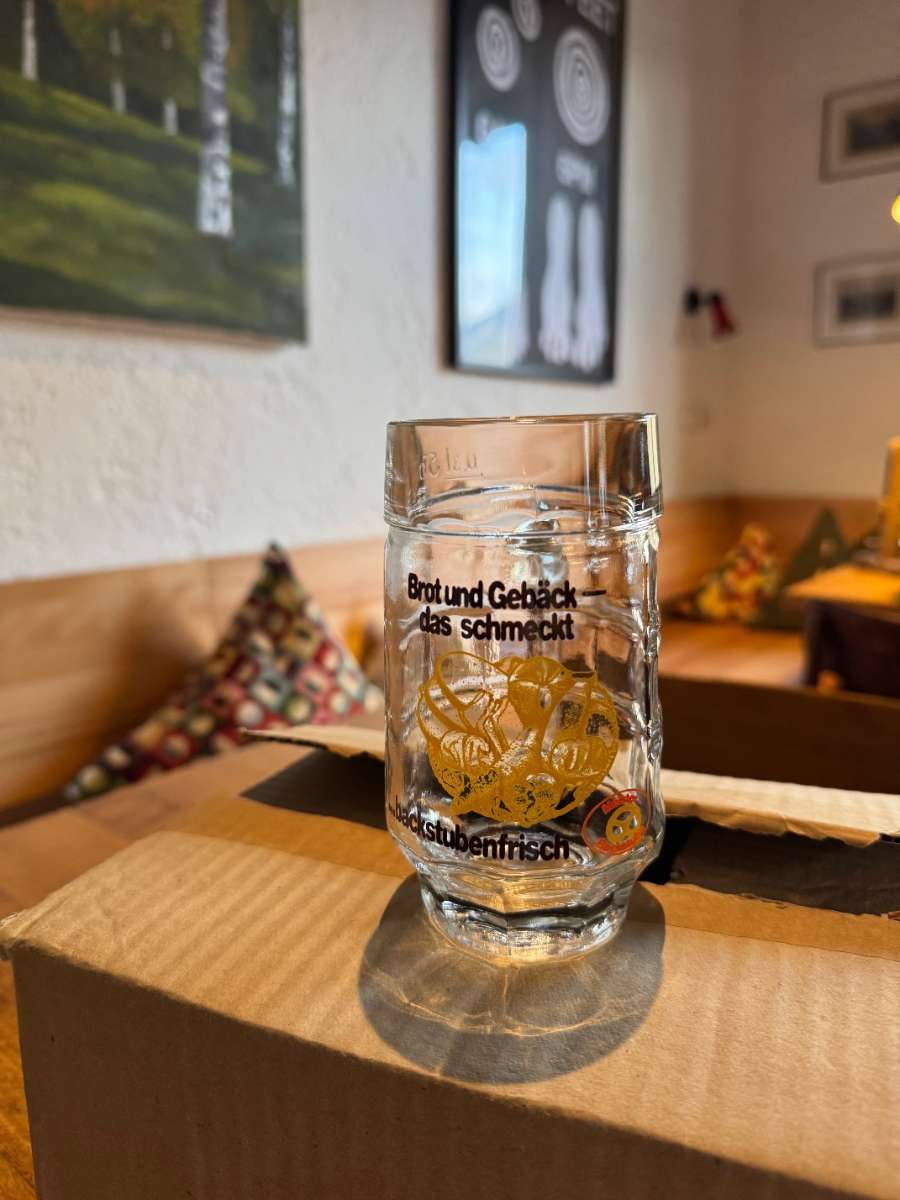 6 Stk. Bierkrügerl alt mit Bäckerwerbung vorne drauf. In sehr gutem Zustand (vielleicht sogar nie benutzt).