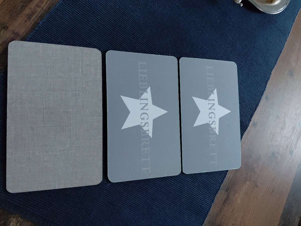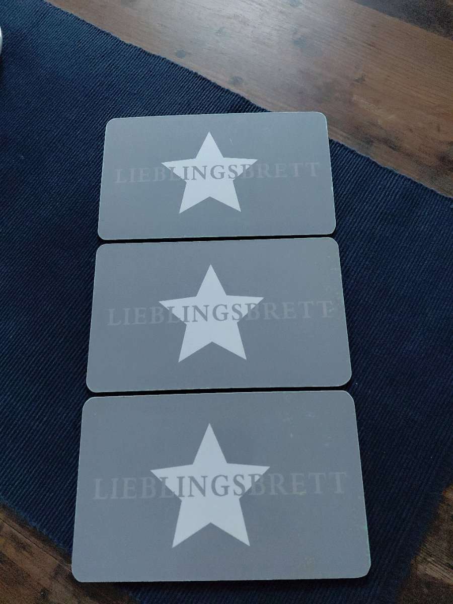 3 Stk. Schneidebretter grau'' Lieblingsbrett '' ...waren in Gebrauch, aber nur selten- sind nur vom Geschirrspüler etwas verfärbt, sonst keine Mängel. Hat zufällig jemand Verwendung dafür..? Bitte auch meine anderen Anzeigen beachten..!