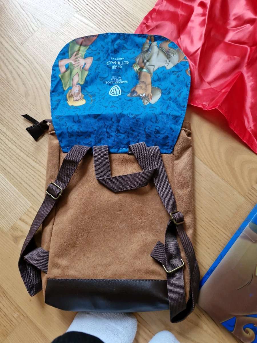 Kinderrucksack mit Spielmappe, Börse und Superheldenumhang zu verschenken. Ethiad Airways Logo