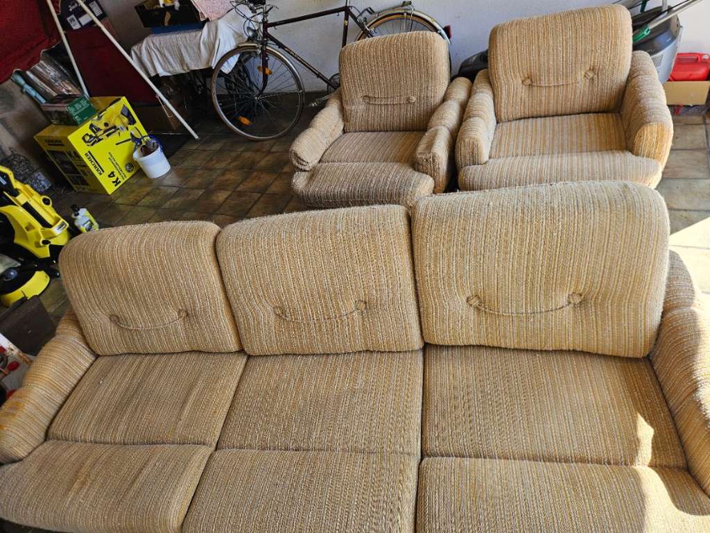 3-er Sofa mit Bettzeugraum, Rückenlehne kann umgeklappt werden. 220 lang, 90 tief, 80 cm hoch; umgeklappt ist die Liegefläche 105 cm breit. Dazu zwei Fauteuils. Renovierungs- und reinigungsbedürftig aber funktionstüchtig. Nur Selbstabholung. Termin nach...
