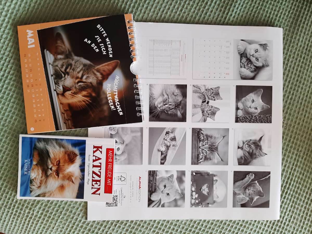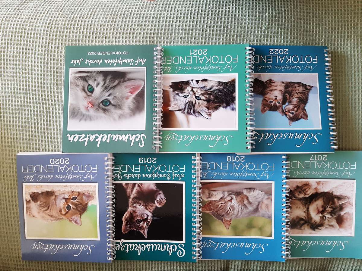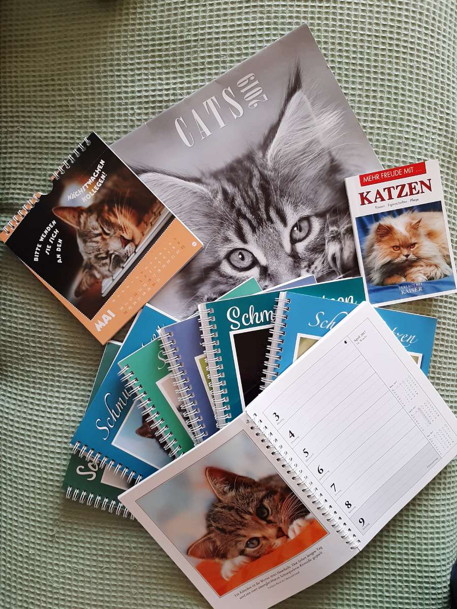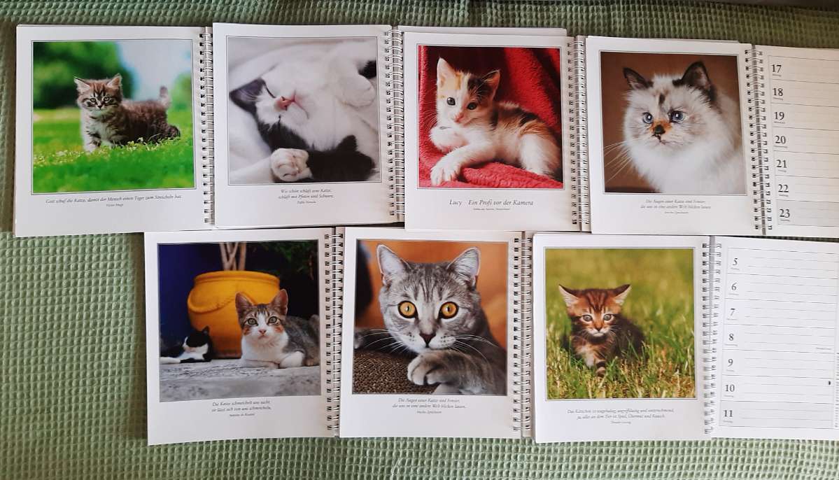 Verschenke 8 Katzenkalender von 2017 bis 2023 sowie 2025 (nicht am Bild) mit jeweils über 50 niedlichen Katzenfotos sowie ein Katzenbuch, 1 schwarz-weiß Kalender mit Bldern im Format von ca. 30x30 cm, 1 kleines Katzenbuch sowie 1 Postkartenkalender (die...