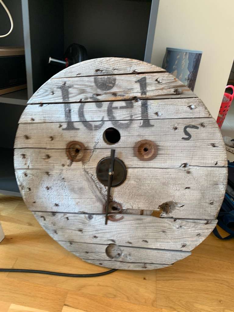Holzplatte von einer Kabelrolle, zu einer Uhr umgebaut, der Uhr-Mechanismus ist aber kaputt. Zum Basteln. Maße: Material: Holz Privatverkauf: keine Garantie, keine Rücknahme