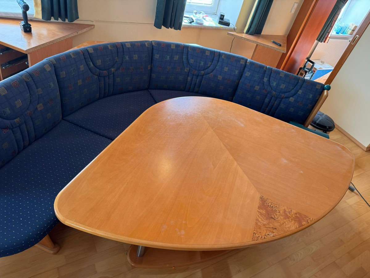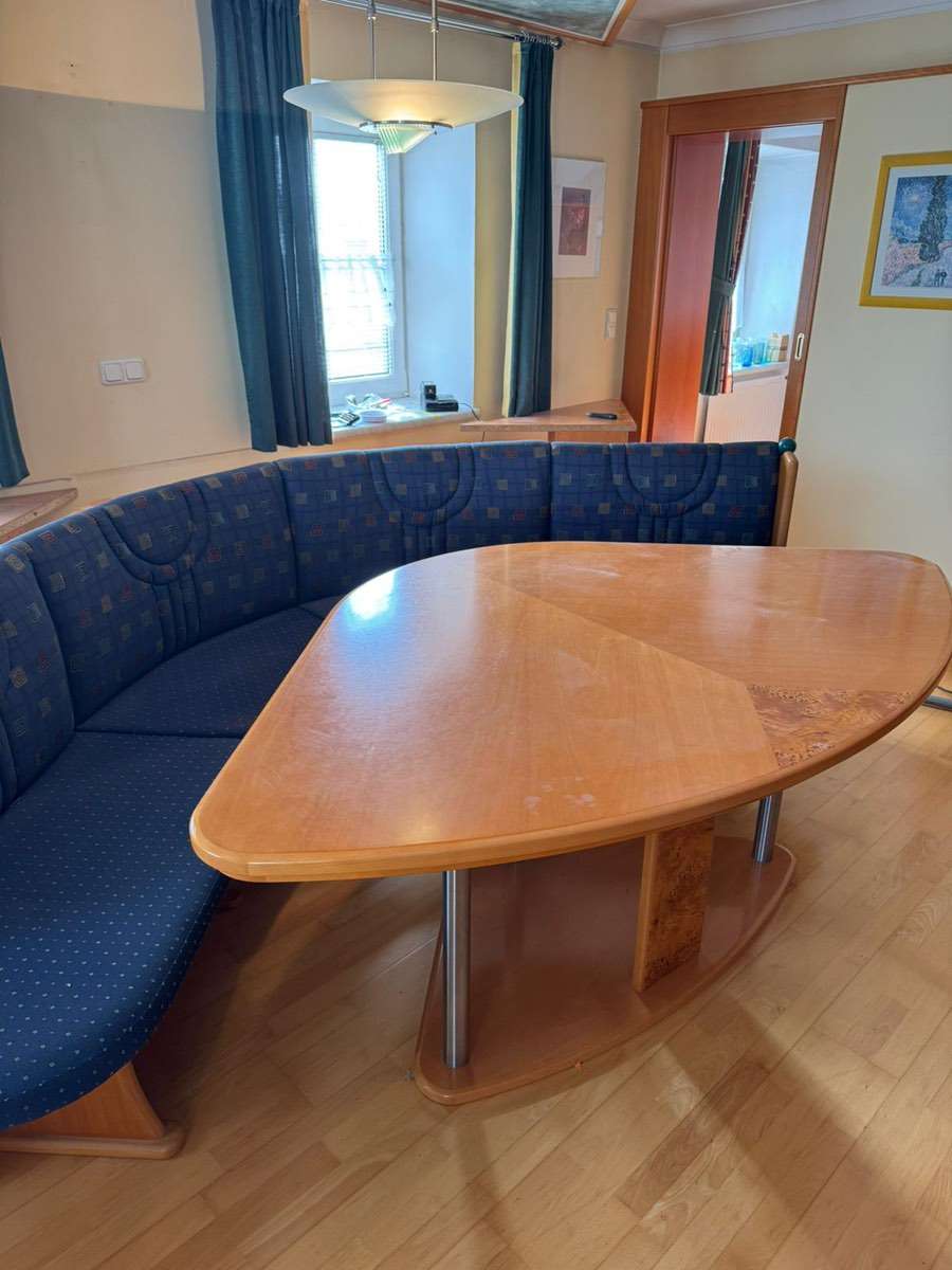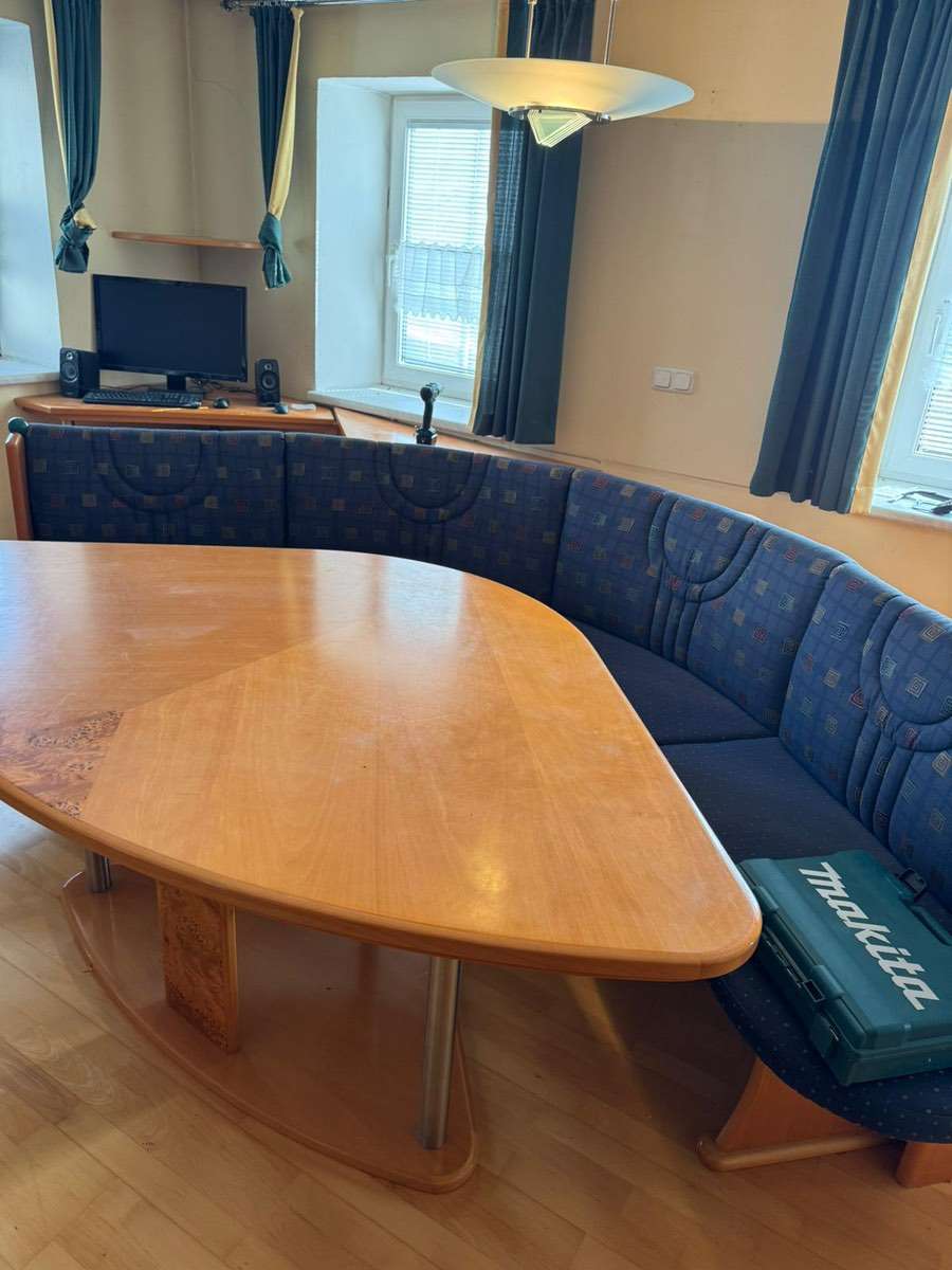 Gesamte Länge 2,75 m, Breite 2 m Tisch: 1,86 m lang, 1,15m breit Selbstabholung und Selbstabbau Massive Tischlerarbeit Ohne Sessel