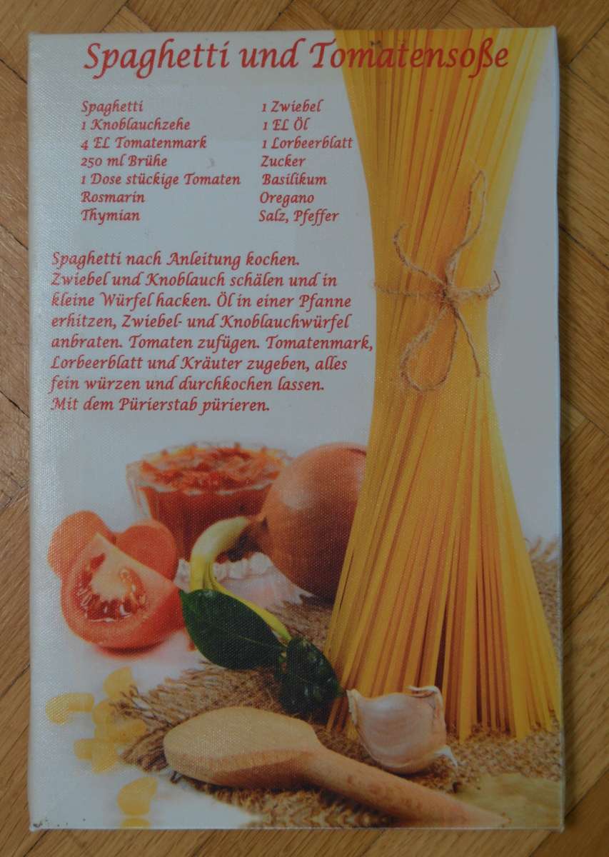 Zwei Keilrahmenbilder, Größe 20x30cm, mit den Rezepten "Spaghetti und Tomatensauce" und "Pfannkuchen" zu verschenken