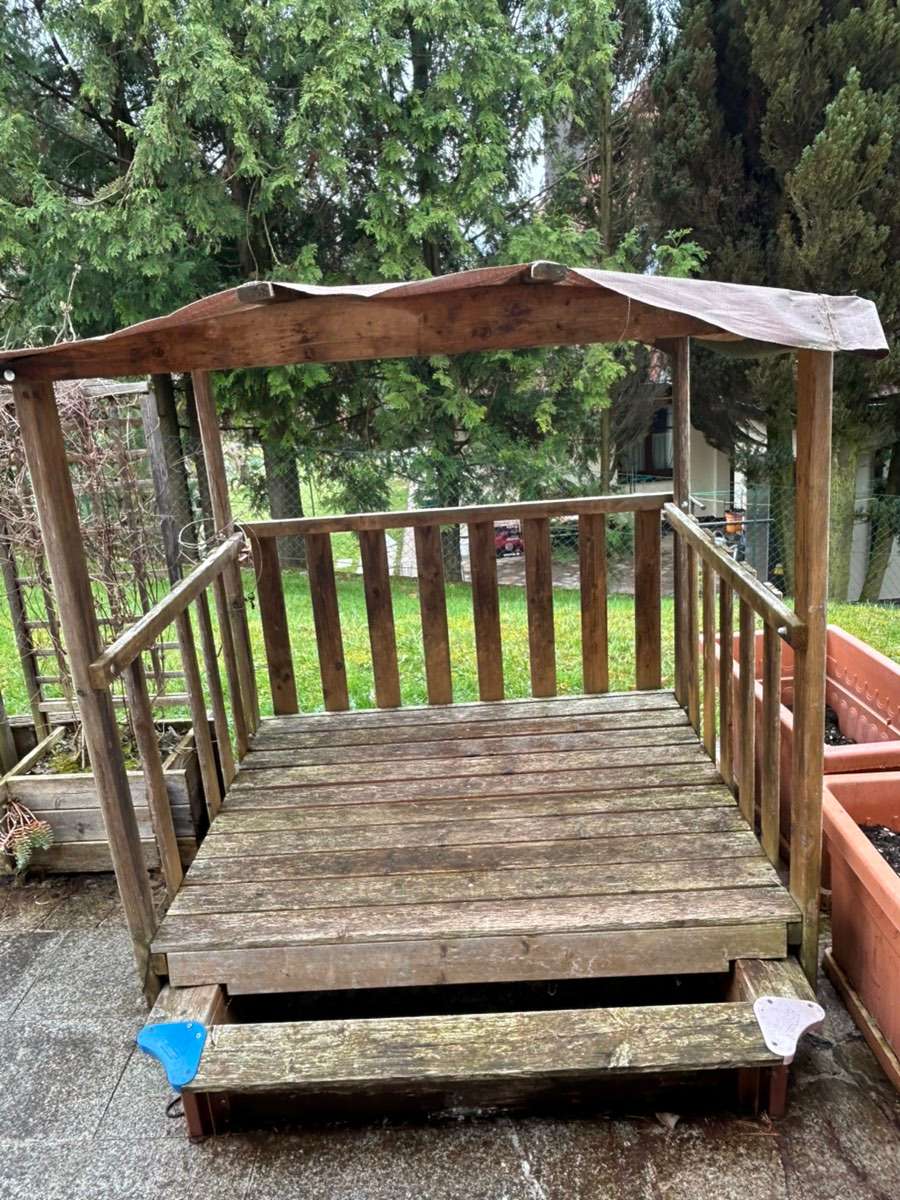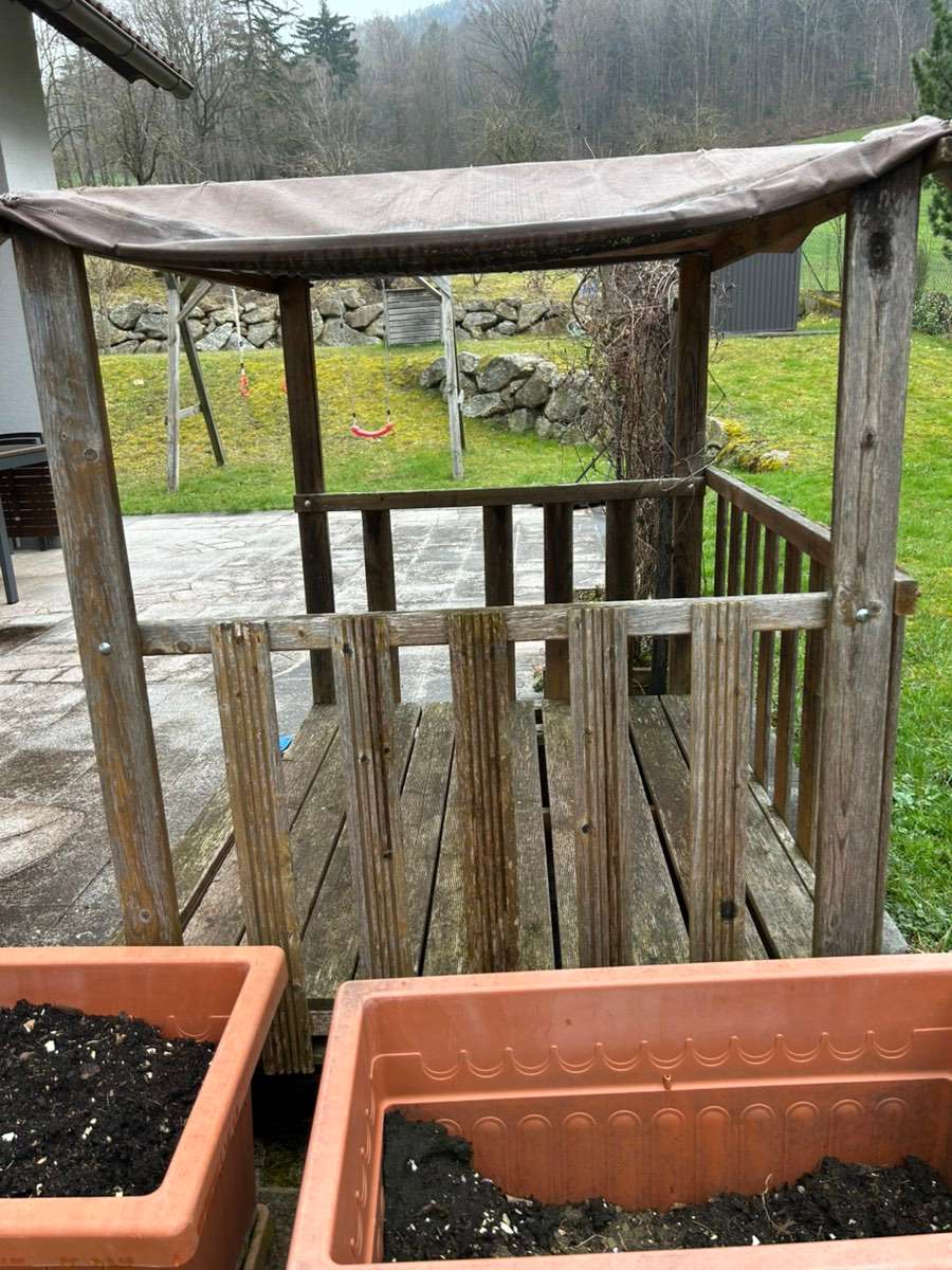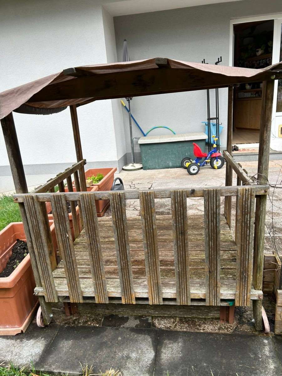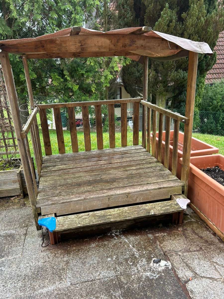 Verschenke älteres Spielhaus mit ausziehbarer Sandkiste. Es muß leider wegen Neugestaltung der Terrasse weg. Meine Enkelkinder haben es so geliebt!