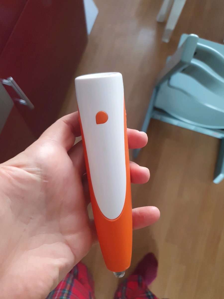Man kann ihn aufdrehen,aber er reagiert nicht bei Kontakt mit den Büchern. Meine Tochter hat vorne an dem Plastik bei der Spitze herumgekaut, vlt deshalb. Vlt kann ihn ja jemand brauchen u reparieren
