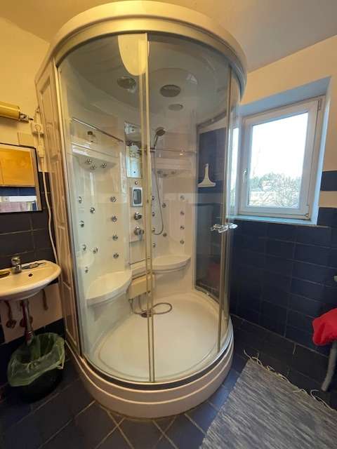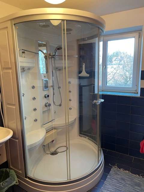 Maße: Höhe 210 cm, Breite 140 cm, Tiefe 110cm. Dampfdusche mit Radio und Beleuchtung. Dampfgenarator  defekt. Dusche funktioniert . Kostenlos bei Selbstdemontage und Mitnahme aller Teile. Ein zweiter neuer Unterbau ist vorhandenund wurde nie eingebaut....