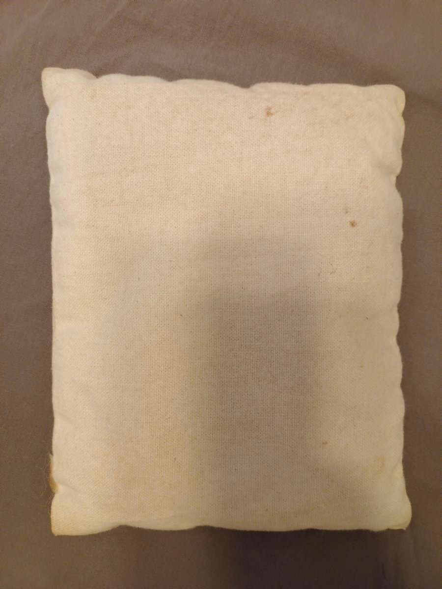 Dieses Kissen war einmal bei zu viel Hitze in der Mikrowelle und hat sich dabei verfärbt. Vielleicht möchte jemand einen neuen Überzug drüber geben und das Wärmekissen dann wieder nutzen