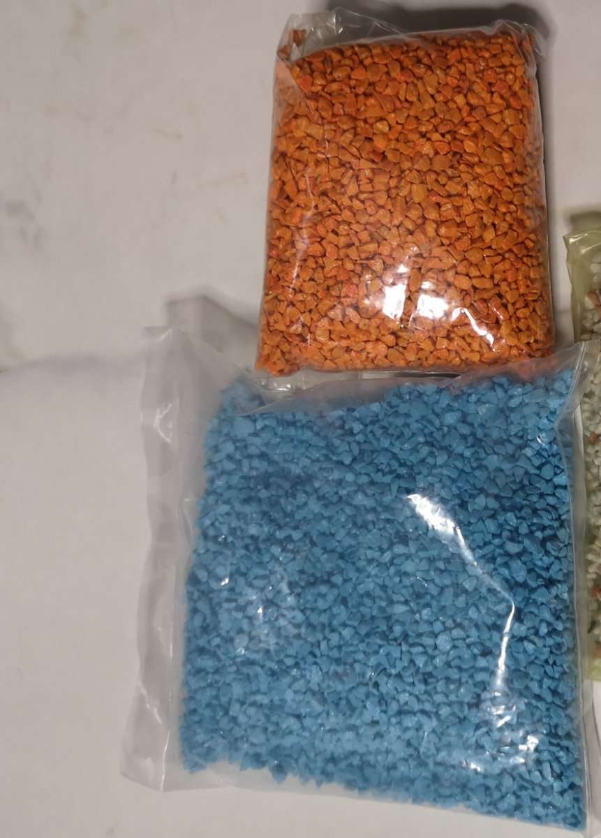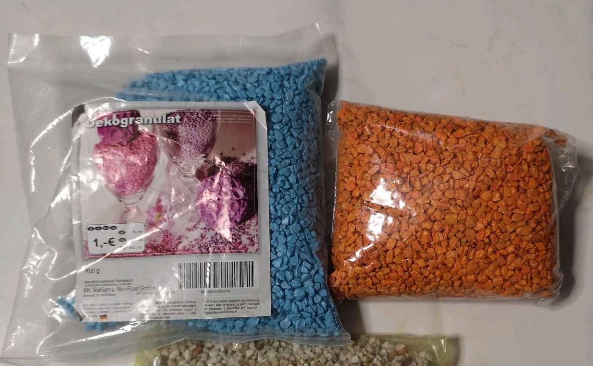 Dekogranulat je ein Sackerl in Türkise und eins in Orange
